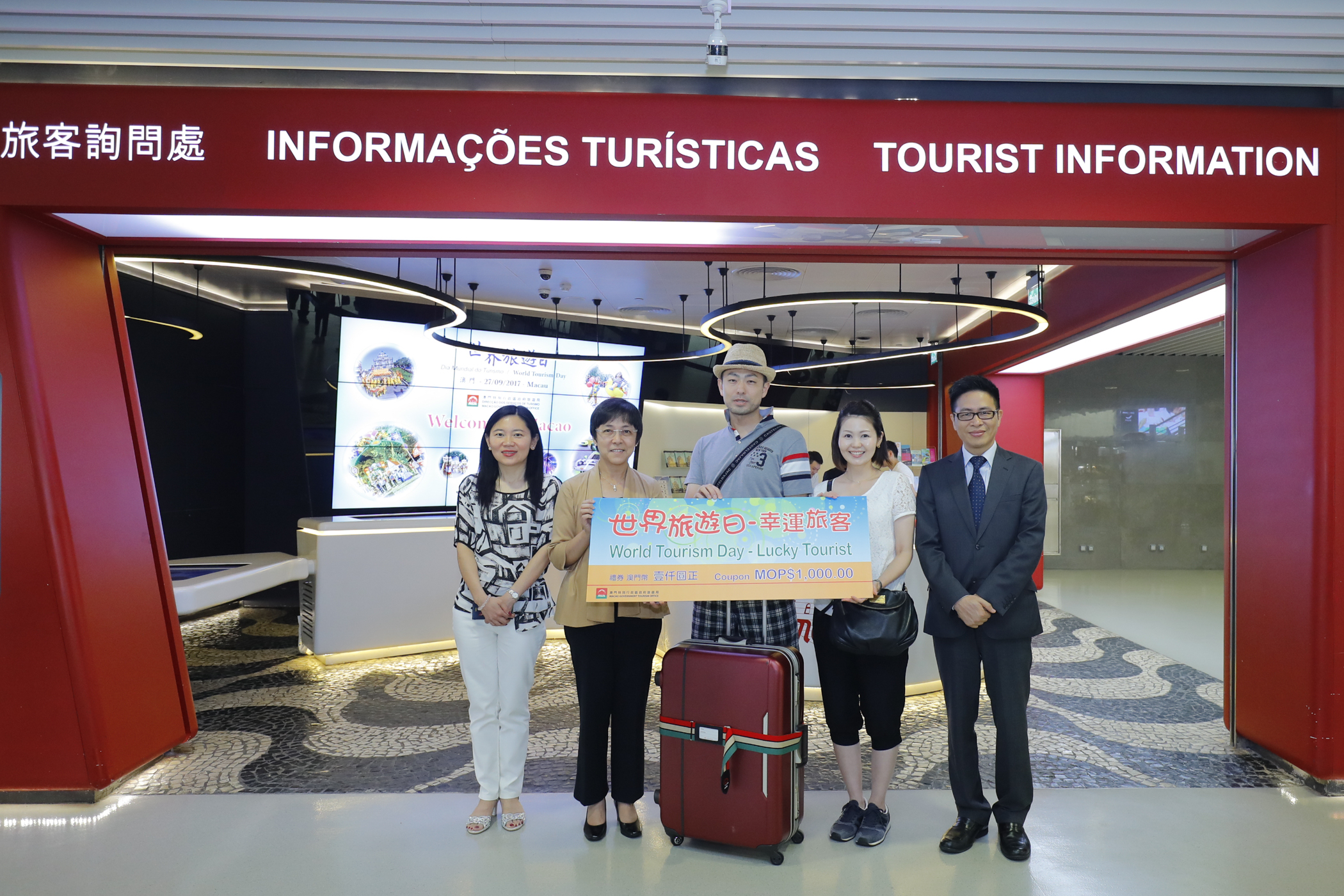 Esta manhã, os dirigentes da DST, surpreenderam os visitantes felizardos do Dia Mundial do Turismo que chegaram ao Terminal Marítimo do Porto Exterior com a oferta de lembranças. Em simultâneo, e durante todo o dia, os balcões de Informações Turísticas da DST, também distribuíram recordações aos visitantes. Este ano, os visitantes felizardos é um casal de apelido Arakawa, proveniente de Japão, que vem a Macau pela primeira vez para passar um dia e uma noite de férias. Através da Internet ficaram a saber que Macau é um destino com património mundial de renome, e por isso desejaram visitar a cidade. Além dos pontos do património mundial, o casal também planeia visitar o Pavilhão do Panda Gigante e a zona do Cotai.