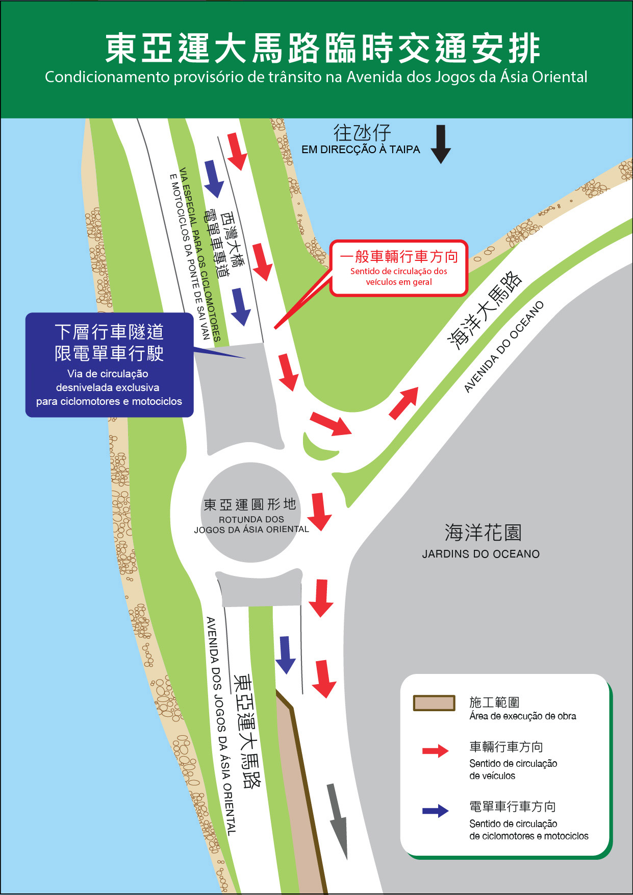 Em articulação com a elevação dos comboios do metro ligeiro, será condicionada a circulação nalguns troços da Avenida dos Jogos da Ásia Oriental e na via de circulação desnivelada em frente da Ponte de Sai Van em direcção à Taipa, pelo que o Gabinete para as Infra-estruturas de Transportes e a Direcção dos Serviços para os Assuntos de Tráfego apelam ao público para prestar atenção à referida medida.