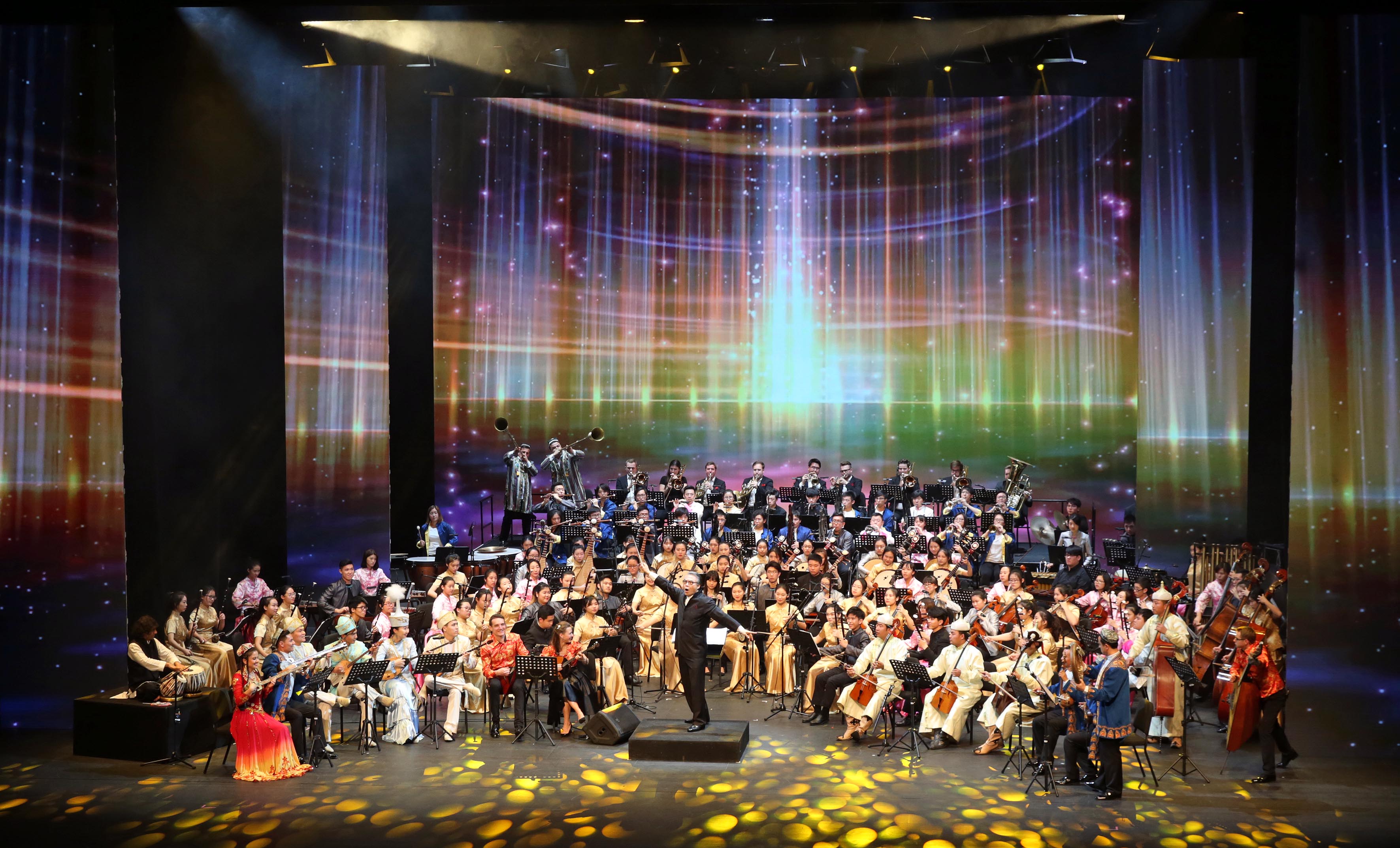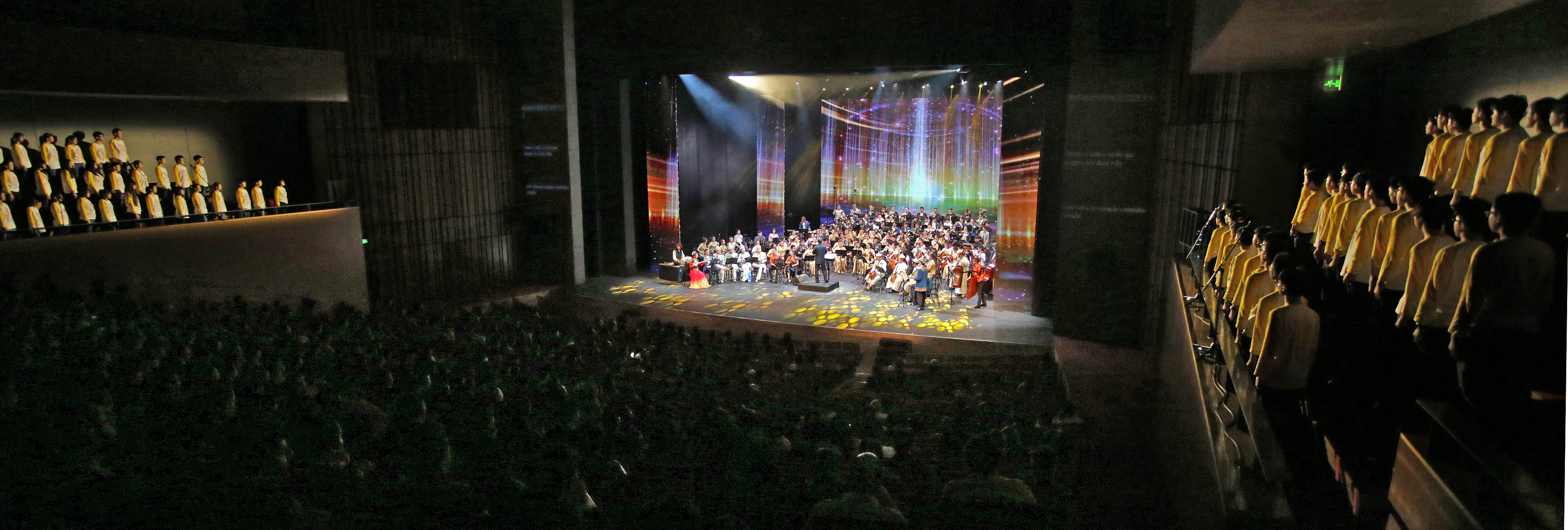 A exibição de encerramento em recinto coberto das“Melodias inesquecíveis da paixão pela Rota da Seda” – Festival Internacional de Música da Juventude, organizada pela Direcção dos Serviços de Educação e Juventude em colaboração com o Instituto Cultural, teve lugar, com sucesso, no passado dia 26 de Novembro de 2017, no Grande Auditório do Centro Cultural de Macau. Mais de 400 jovens músicos locais e de países e regiões pertencentes à plataforma “Uma Faixa, Uma Rota” reuniram-se em Macau para celebrar a cultura e a história da Roda de Seda. O Excelentíssimo Secretário para os Assuntos Sociais e Cultura, Alexis, Tam Chon Weng, o Comandante da Guarnição em Macau do Exército de Libertação do Povo Chinês, Wang Wen, a Directora dos Serviços de Educação e Juventude, Leong Lai, a Chefe do Departamento da Educação e Assuntos de Juventude do Gabinete de Ligação do Governo Central na Região Administrativa Especial de Macau, Xu Ting, o Chefe do Departamento dos Assuntos de Taiwan do Gabinete de Ligação do Governo Central na Região Administrativa Especial de Macau, Xu Mang, a esposa do Comissário do Gabinete do Comissariado do Ministério dos Negócios Estrangeiros da República Popular da China na Região Administrativa Especial de Macau, Qiu Weiwei, a Subinspectora do Departamento de Saúde, Desporto e Educação Artística do Ministério da Educação da China, Wan Lijun, o Subinspector do Gabinete dos Assuntos de Hong Kong, Macau e Taiwan do Conselho dos Assuntos da Macau Chinesa, Lan Haibin, a Presidente do Instituto de Formação Turística, Vong Chuk Kwan, o Cônsul Substituto do Consulado-Geral da República do Cazaquistão em Hong Kong, o Vice-cônsul do Consulado-Geral da República da Federação Russa em Hong Kong, o Assessor do Gabinete do Secretário para os Assuntos Sociais e Cultura, Wai Cheng Iong, o Presidente da Associação Promotora de União da Nação da China, Vong Veng Hin, o Subdirector dos Serviços de Educação e Juventude, Lou Pak Sang e a Subdirectora dos Serviços de Educação e Juventude, Leong Vai Kei, apreciaram a exibição da passada noite e registaram o momento em fotos com todos os artistas, numa atmosfera calorosa e acolhedora.