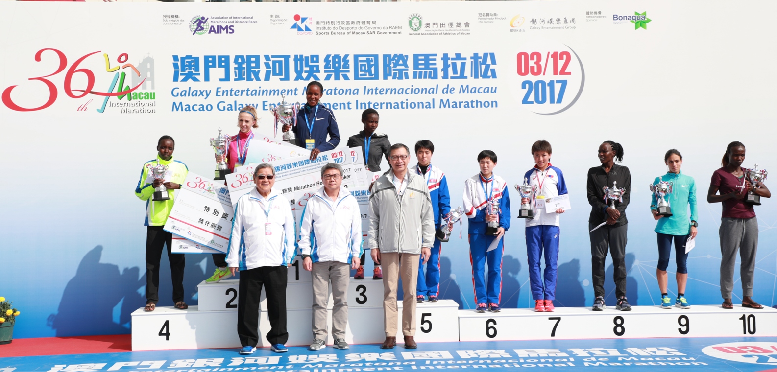 Estiveram presentes na cerimónia da entrega de prémios o Secretário para os Assuntos Sociais e Cultura, Doutor Alexis Tam, o Presidente do Instituto do Desporto, Pun Weng Kun, o Presidente da Associação Geral de Atletismo de Macau, Ma Iao Hang, o Vice-Presidente do Galaxy Entertainment Group, Francis Lui, o Presidente do Conselho Administrativo de IACM, José Tavares, os Vices-Presidentes do Instituto do Desporto, Allen Lau e Christine Lam, Chefe do Departamento de Juventude da Direcção dos Serviços de Educação e Juventude, Chan Iok Wai, o Presidente do Comité Olímpico e Desportivo de Macau, Charles Lo, o Presidente e o Vice-Presidente da Direcção da Asssociação Geral de Atletismo, Lam Hin Fu e Chan Pou Sin, a Vice-Presidente do Comité Olímpico de Portugal, Rosa Mota, Assessor da Galaxy Entertainment Group, Dr. Neto Valente, o Director da Galaxy Entertainment Group, Philip Cheng, o Director dos Recursos Humanos e de Administração da Galaxy Entertainment Group, Trevor Martin, e o Vice-Presidente Sénior de Administração de Instalações da Galaxy MacauTM, Chan Chee Pong, e membros do Conselho do Desporto, entre outros.