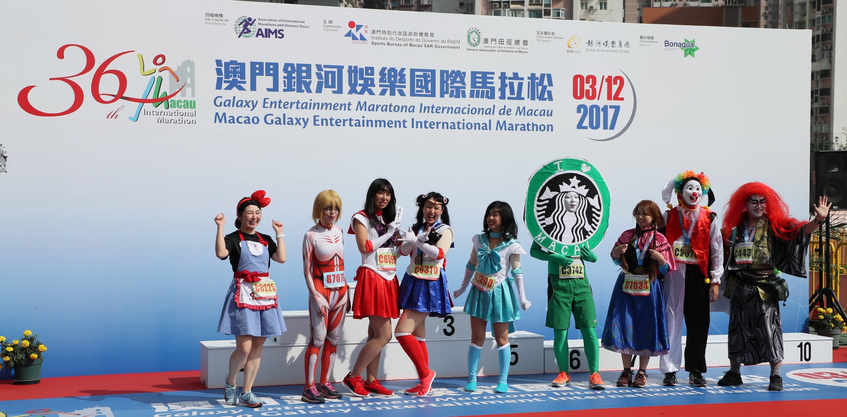 Foram organizados os concursos do “Descarregamento das suas melhores fotografias” e “Prémio de Vestuário Mais Criativo” durante a maratona do ano anterior, pelo que será organizado de novo este ano. Dentro desses, muitos participantes vestiram muito lindos para concorrer o “Prémio de Vestuário Mais Criativo”, e foi premiado no Evento. Por outro lado, os atletas e espectadores da maratona podem participar hoje ou amanhã através do App a fotografia com o tema da “Maratona Internacional de Macau”para o concurso “Descarregamento das suas melhores fotografias”, com a possibilidade de ganhar um carro, e outros prémios são incluidos alojamentos de hotel, cupões de refeições, cupões de spa e bilhetes de cinema. Os resultados serão publicados no dia 7 de Dezembro de 2017 (quinta-feira) nas páginas do Instituto do Desporto (www.sport.gov.mo) e da Maratona Internacional de Macau (www.macaomarathon.com).