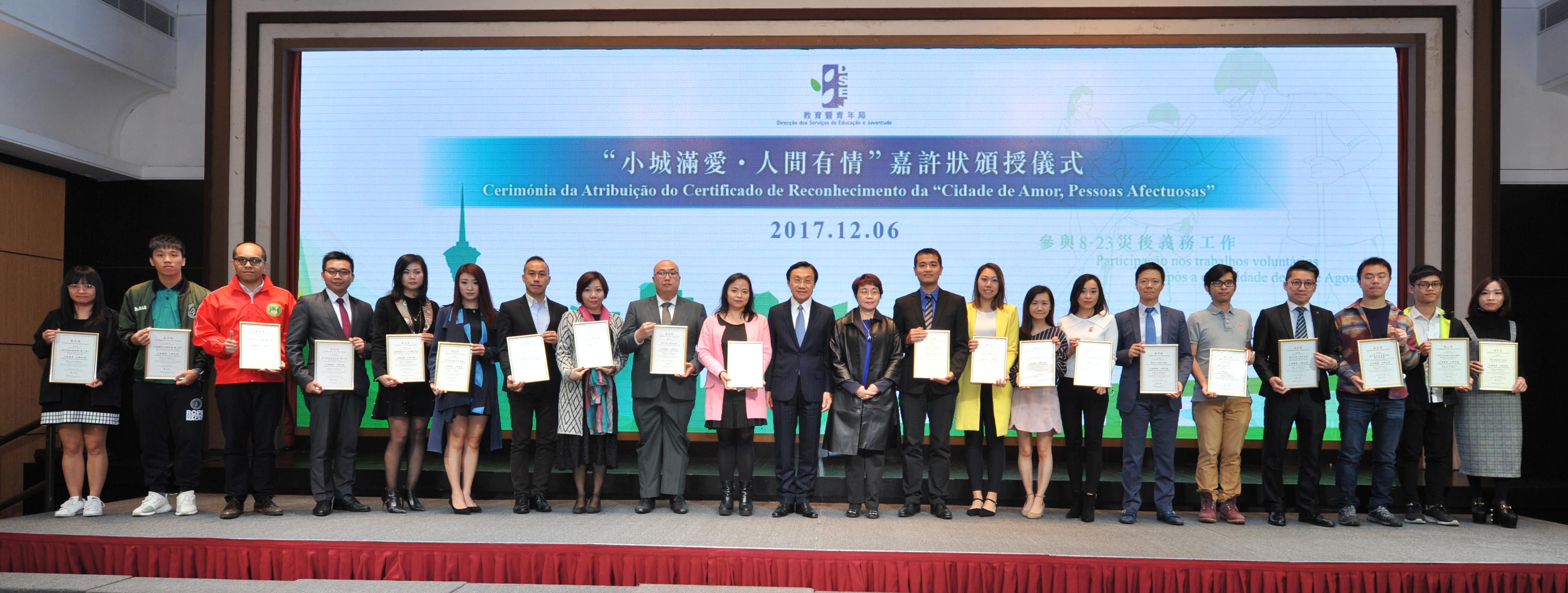 A reunião conjunta dos Conselhos de Educação para o Ensino Não Superior e de Juventude teve lugar na tarde do dia 6 de Dezembro, na Torre de Macau, e foi presidida pelo presidente dos dois conselhos, o Secretário para os Assuntos Sociais e Cultura, Alexis Tam Chon Weng. Antes do início da reunião, realizou-se a Cerimónia de Entrega do Certificado do Sistema de Gestão da Qualidade ISO 9001:2015, relativa à fase de requerimento do apoio financeiro do “Plano de Desenvolvimento das Escolas” e foram atribuídos os Certificados de Reconhecimento “Cidade de Amor, Pessoas Afectuosas” às associações juvenis que participaram nos trabalhos voluntários realizados após a calamidade resultante da passagem do tufão Hato pela região.