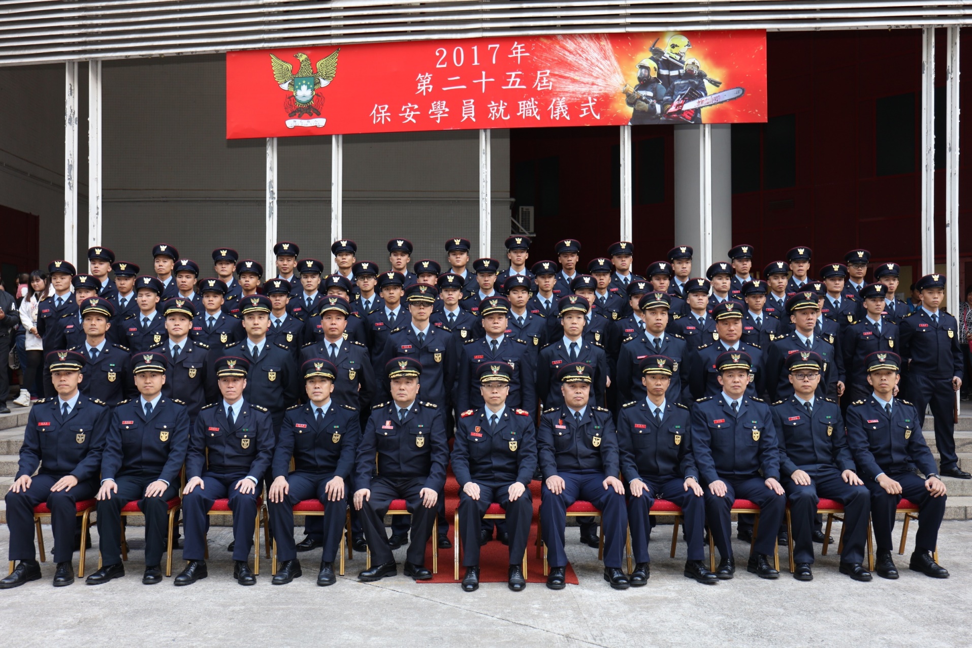 O Corpo de Bombeiros (CB) realizou no dia 12 de Dezembro de 2017, na Escola de Bombeiros, a cerimónia de tomada de posse dos 44 instruendos do 25.º Curso de Formação de Instruendos das Forças de Segurança de Macau, que foi presidida pelo Comandante do CB, chefe-mor Leong Iok Sam.