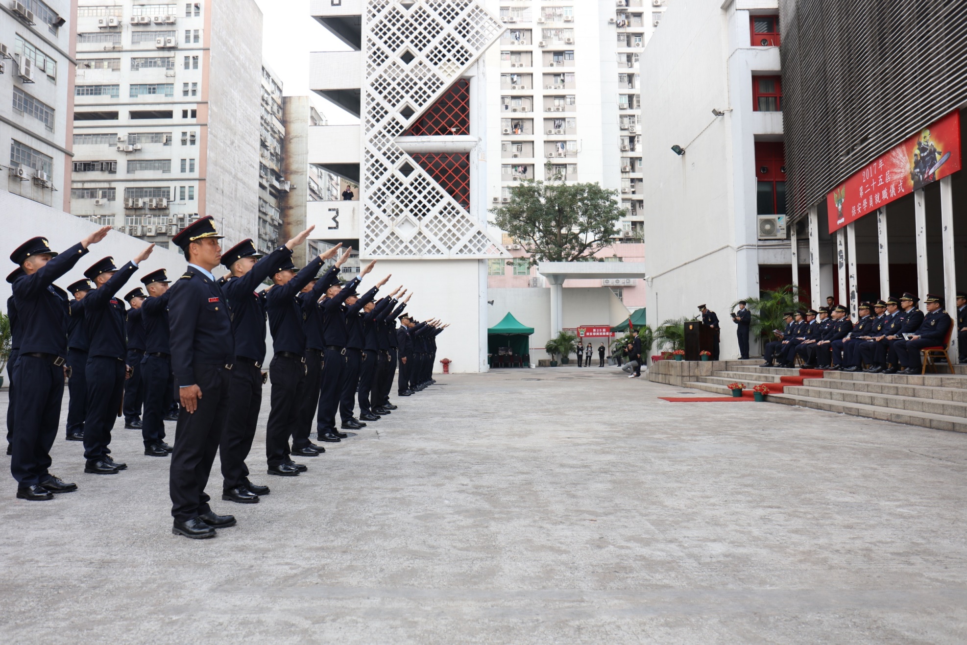 O Corpo de Bombeiros (CB) realizou no dia 12 de Dezembro de 2017, na Escola de Bombeiros, a cerimónia de tomada de posse dos 44 instruendos do 25.º Curso de Formação de Instruendos das Forças de Segurança de Macau, que foi presidida pelo Comandante do CB, chefe-mor Leong Iok Sam.