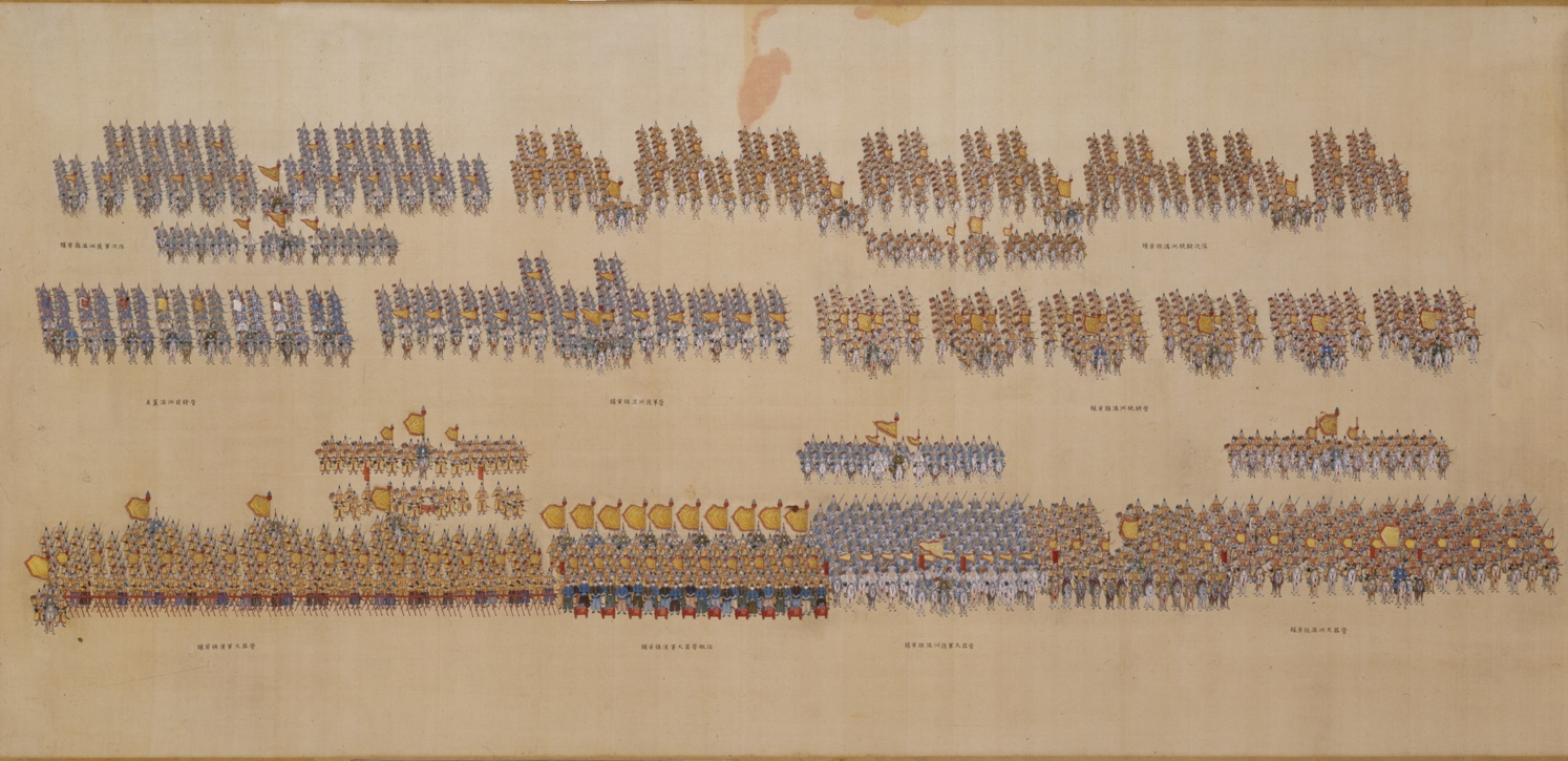Os Oito Estandartes eram um dos mais importantes sistemas do período Qing. A secção “Sistema Militar” apresenta diversas relíquias, tais como o “Sinete do Comandante do Corpo de Guarda do Estandarte Branco” com pega de prata em forma de tigre e o Registo em cobre inscrito com “Mover os oficiais e soldados do Batalhão de Vanguarda e Corpo de Guarda”, as quais reflectem o poder militar do sistema dos Oito Estandartes da dinastia Qing, bem como o rigoroso sistema de regras que existia na corte imperial para as sentinelas, guardas do palácio e vistorias. Está ainda exposto a “Ilustração da formação de exercício da Força Expedicionária de Pequim” relativa ao treino secreto do primeiro exercício da força expedicionária dedicada a armas de fogo do mundo, estabelecido durante o reinado do Imperador Yongle, e também a “ Ilustração da formação de Batalha do Novo Exército Wusheng” relativa aos treinos do Novo Exército de Wusheng, posteriormente rebaptizado “Novo Exército”, uma divisão criada no período tardio da dinastia Qing ao estilo dos exércitos ocidentais, entre outros documentos. Estas duas ilustrações demonstram claramente as mudanças mais relevantes na disposição e exercícios militares entre as tropas mais tradicionais da China e as do período moderno.