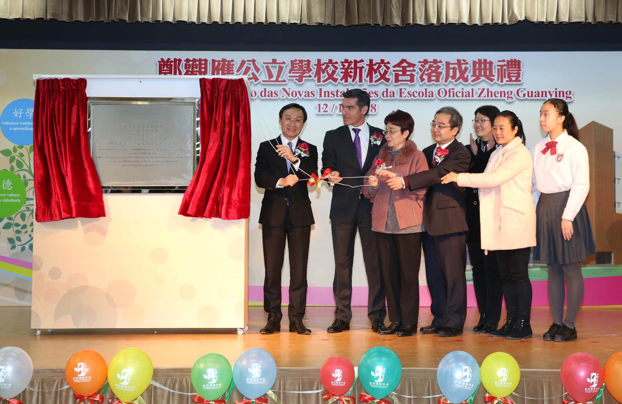 Realizou-se, no dia 12 de Janeiro de 2018, a Cerimónia de inauguração do novo edifício escolar da Escola Oficial Zheng Guanying, afecta à Direcção dos Serviços de Educação e Juventude (DSEJ), presidida pelo Senhor Secretário para os Assuntos Sociais e Cultura da RAEM, Alexis Tam Chon Weng, acompanhado pelo Cônsul-Geral de Portugal em Macau e Hong Kong, Vítor Sereno, pela Directora dos Serviços de Educação e Juventude, Leong Lai, pelo Chefe de Divisão do Departamento de Educação e Trabalhos Juvenis do Gabinete de Ligação do Governo Popular Central da RPC na RAEM, Gou Renmin, pela Directora da Escola Oficial Zheng Guanying, Wu Kit, pela Presidente da Associação dos Encarregados de Educação da Escola Oficial Zheng Guanying, Zhong Kit Hong e pela representante dos alunos, Lo Sam In.