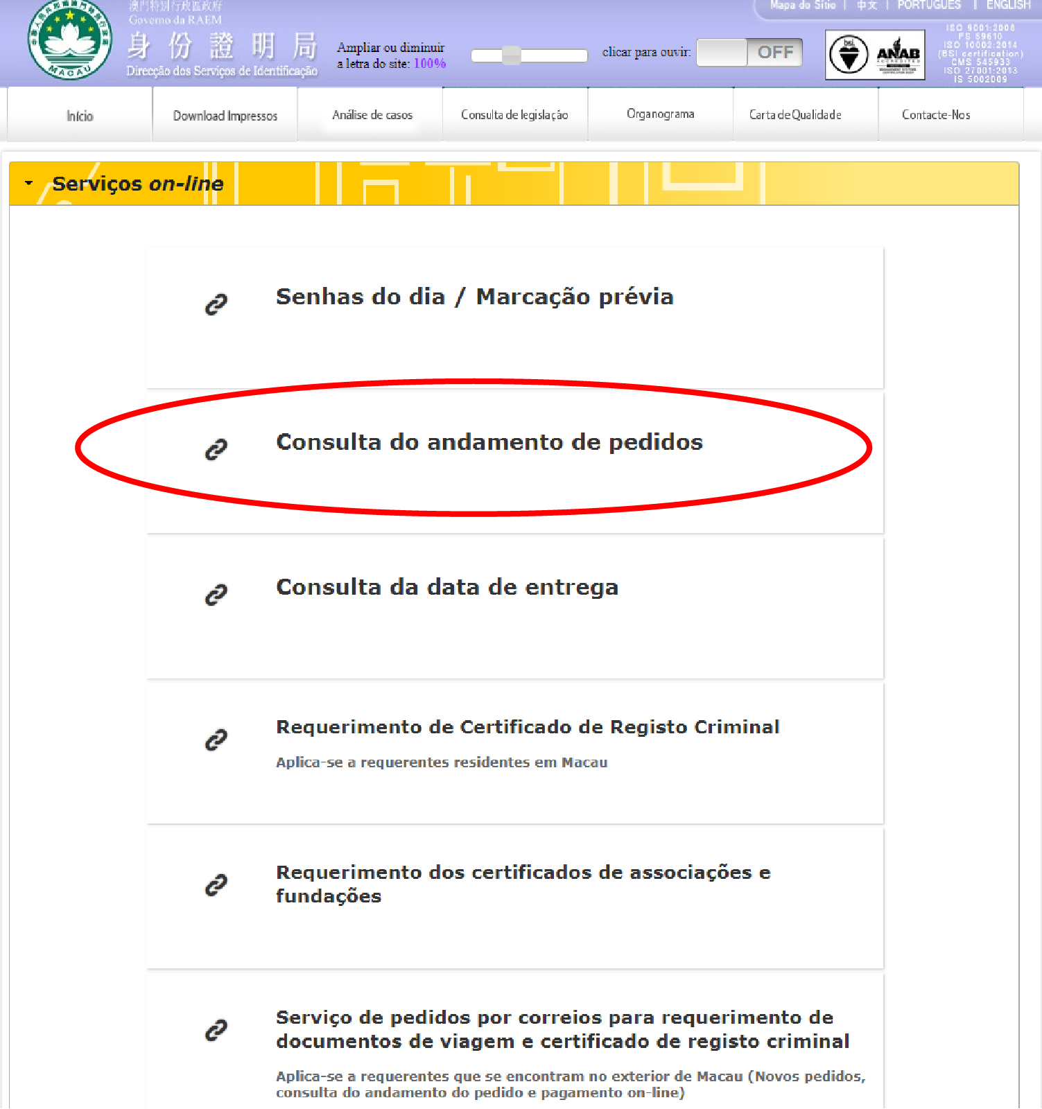 Através do acesso ao novo sistema de consulta on-line (https://webservice/dsi.gov.mo/EnquiryService/index.jsp?lang=P), o requerente pode consultar instantaneamente em que fase se encontre o seu pedido, e para o efeito terá de introduzir o número do recibo e a data de apresentação do pedido. Posto isso, aparecerá uma menssagem a informar o requerente, por exemplo “Finalizou a apresentação do pedido com sucesso”, “O pedido está nos seus trâmites”, “O pedido está pendente ou em fase de apreciação”, “Já havia sido concluída a produção” ou “Já havia sido levantado o documento”, etc.