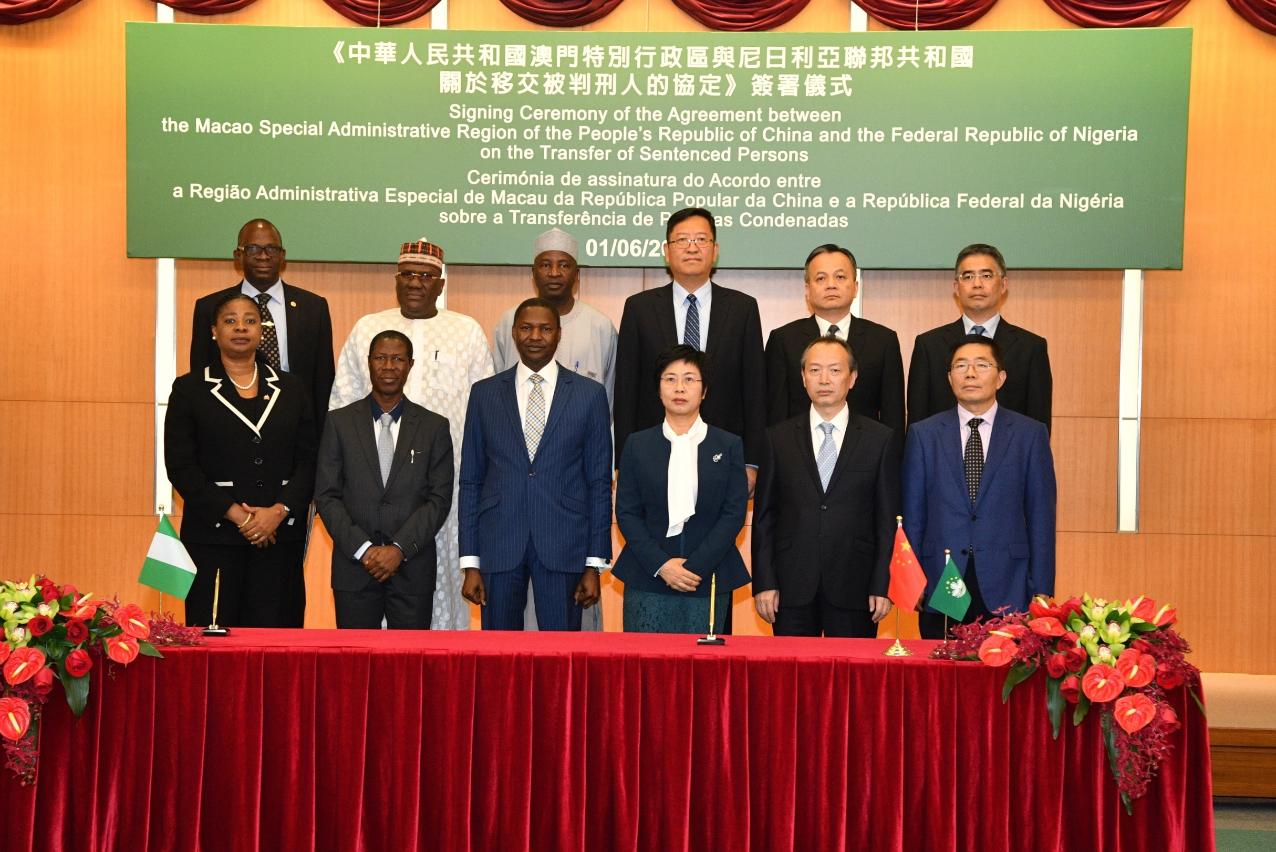 Hoje (1 de Junho), a Exma. Sra. Dra. Sónia Chan, Secretária para a Administração e Justiça, e o Sr. Dr. Abubakar Malami, Procurador-Geral Federal e Ministro do Ministério da Justiça da República Federal da Nigéria, celebraram, na sede do Governo da RAEM, o Acordo sobre a Transferência de Pessoas Condenadas entre a Região Administrativa Especial de Macau da República Popular da China e a República Federal da Nigéria.
