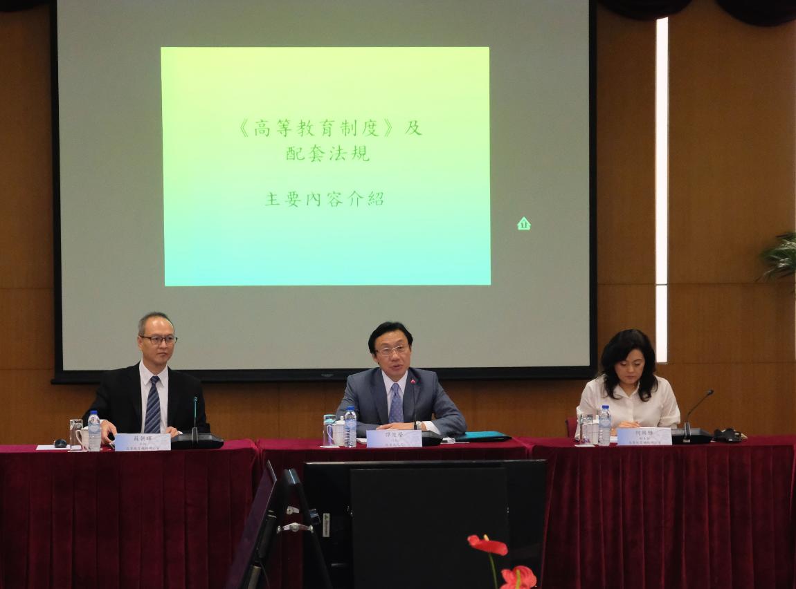 A sessão de apresentação foi presidida pelo Secretário Alexis Tam Chon Weng, o Coordenador, Sou Chio Fai, a Coordenadora-Adjunta, Sílvia Ribeiro Osório Ho e o Coordenador-Adjunto, Chang Kun Hong, do GAES participaram. O Secretário afirmou que, sob o novo regime, a gestão das instituições de ensino superior de Macau vai ser mais rigorosa, a organização dos cursos e o ensino vão ter mais flexibilidade, ao mesmo tempo, o Governo dá apoios suficientes às instituições para promover a melhoria dos seus níveis científico e de investigação, criando condições para a articulação do ensino superior de Macau com o internacional.