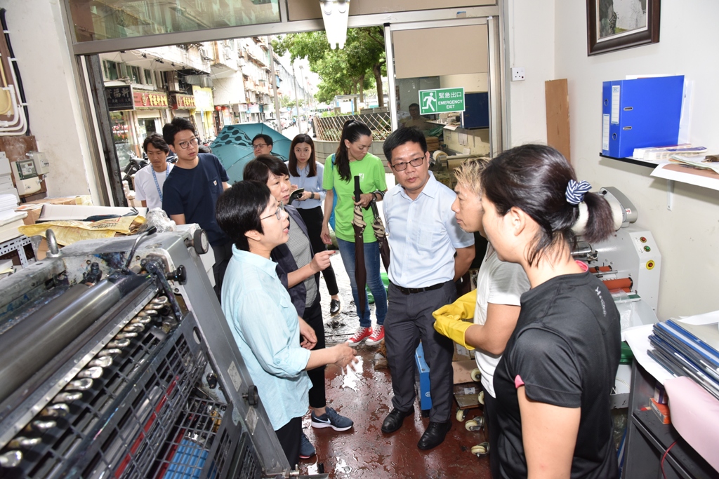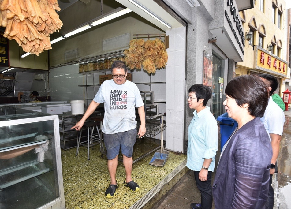 A Secretária para a Administração e Justiça, Dra. Sónia Chan, juntamente com a Chefe do Gabinete, Dra. Iao Man Leng, o Chefe dos Serviços de Ambiente e Licenciamento do Instituto para os Assuntos Cívicos e Municipais, Dr. Fong Vai Seng, e o Chefe substituto da Divisão de Higiene Ambiental, Dr. Ao Wai San, deslocaram-se hoje (dia 17) pela manhã, às zonas próximas da Praça de Ponte e Horta, do Pagode do Bazar e da Rua Cinco de Outubro, para acompanhar a situação das mesmas após o tufão e inundações, bem como auscultar as opiniões dos cidadãos.