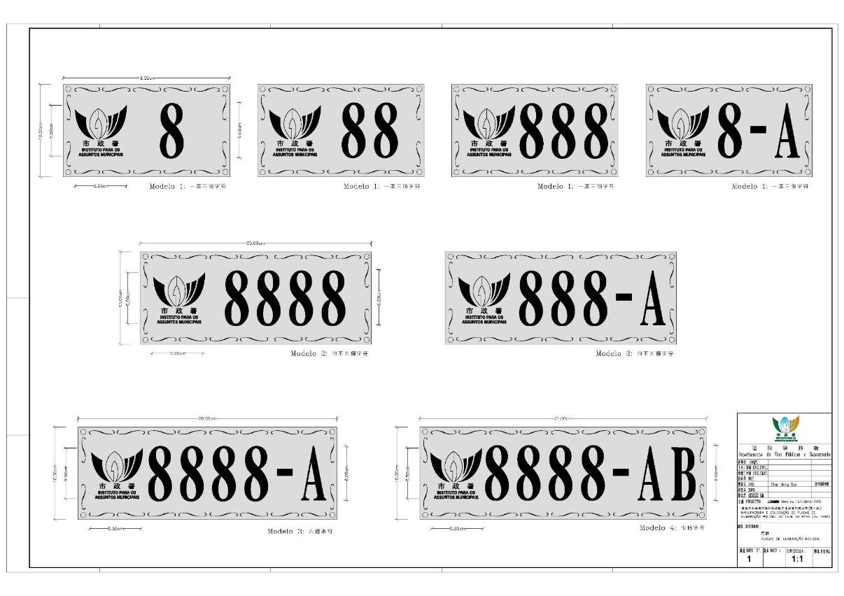 Actualmente, estão registados cerca de 36 mil números policiais em Macau, os quais não estão uniformizados, apresentando estilos diferentes. Por isso, o IAM criou um novo formato para a numeração policial, substituindo todas as antigas placas da Região Administrativa Especial de Macau por outras de formato uniforme. O novo formato das placas de numeração policial irá conter a designação do IAM em chinês e português, bem como o logotipo do Instituto. As placas são divididas em quatro modelos — modelo 1: com a dimensão de 18 centímetros de comprimento por 10 centímetros de largura (de 1 a 3 caracteres); modelo 2: com a dimensão de 25 centímetros de comprimento por 10 centímetros de largura (de 4 a 5 caracteres); modelo 3: com a dimensão de 28 centímetros de comprimento por 10 centímetros de largura (6 caracteres); e o modelo 4: com a dimensão de 31 centímetros de comprimento por 10 centímetros de largura (7 caracteres).