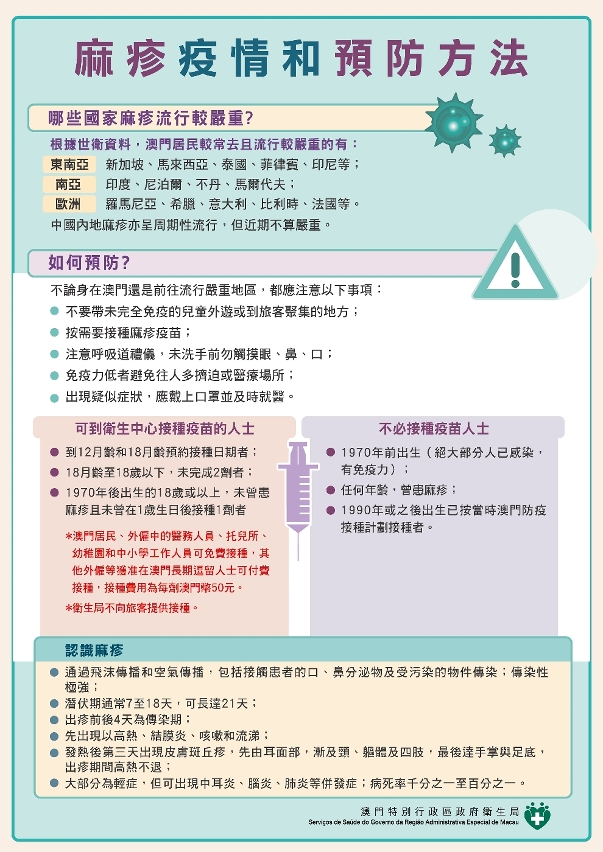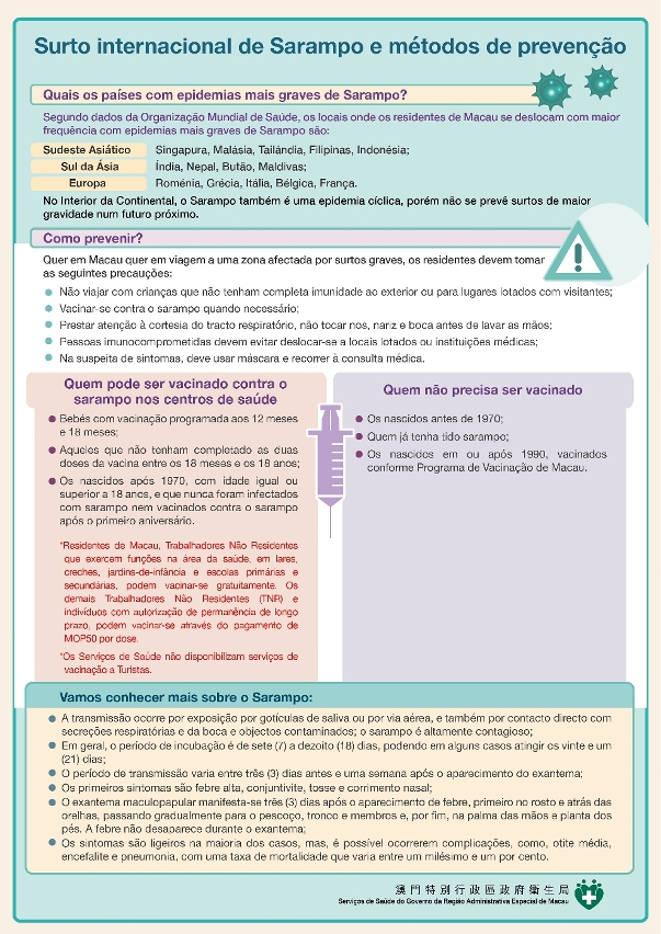 Segundo o Programa de Vacinação de Macau, as pessoas que ainda não tenham completado os 18 anos podem receber gratuitamente 2 doses de vacina tríplice contra o sarampo. Normalmente a vacina é administrada aos 12 meses e 18 meses de idade.
