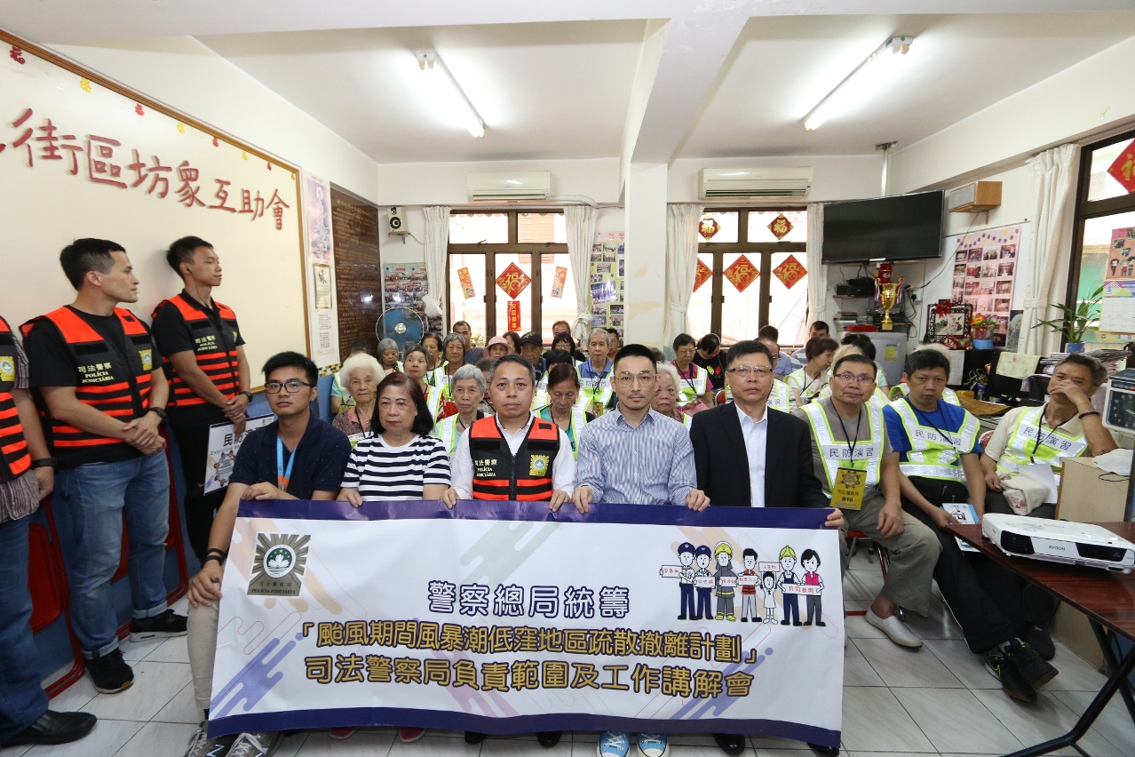 Tendo em conta a proximidade da época de tufões, a Polícia Judiciária, em conjunto com o Instituto de Acção Social e em coordenação com os Serviços de Policia Unitários, realizou uma sessão de esclarecimento e simulacro do “Plano de evacuação das zonas baixas em situações de Storm Surge durante a passagem de tufão”. Esta acção, que foi aberta e contou com a participação dos cidadãos inscritos, teve em vista reforçar a consciência da população sobre a prevenção de desastres e riscos e assegurar que os cidadãos sigam as indicações das autoridades durante a passagem de tufão para se proceder rapidamente e de forma ordenada à evacuação das zonas de baixa. Estas actividades têm por objectivo dar a conhecer aos cidadãos como devem agir no processo de evacuação em situações de Storm Surge, melhorar a capacidade da resposta e coordenação da equipa do plano de evacuação da PJ na execução desse plano, recolher as opiniões dos cidadãos sobre o trabalho sobre o plano bem como melhorar o procedimento dos respectivos trabalhos.