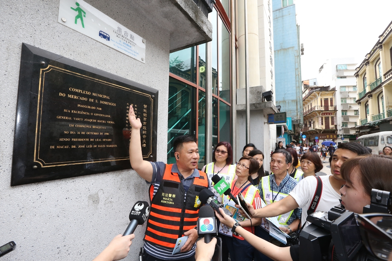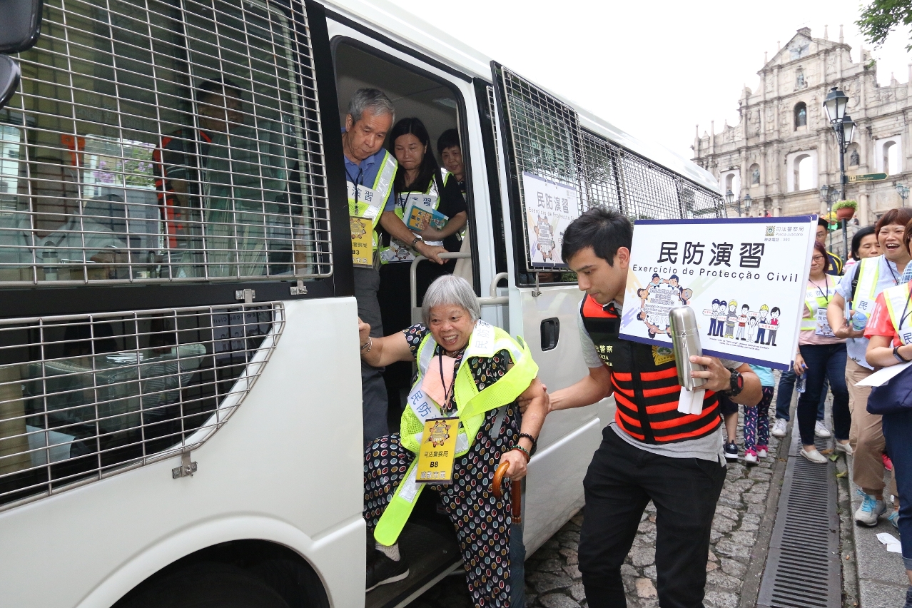 Após a realização de sessão de esclarecimento, a PJ realizou um simulacro de evacuação durante a passagem de tufão conforme as indicações dadas pela Estrutura de Protecção Civil. Durante o simulacro, o pessoal da PJ dirigiu-se às zonas designadas para executar as tarefas, divulgando aos moradores e lojistas que participaram neste simulacro, as instruções para prevenção de desastre de Storm Surge, explicando-lhes as localizações e equipamentos dos centros de abrigo próximos, as rotas de evacuação, assistindo as pessoas com necessidades especiais para se dirigirem ao local de encontro e ao centro de abrigo.