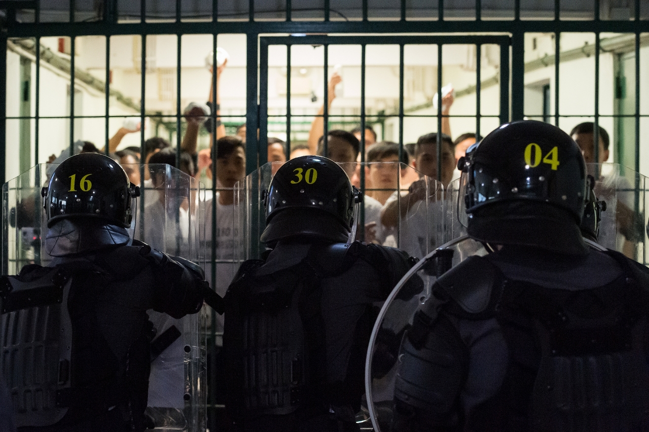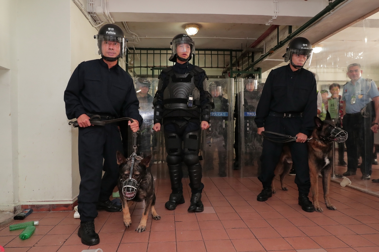 Ao mesmo tempo, a Unidade Especial de Polícia e o Grupo Cinotécnico do CPSP, a Equipa Anti-motim do EPC e os agentes dos CB, com recurso a escudos tácticos, granada sónica e pulverizador de pimenta, entraram à força na cela e detiveram imediatamente os reclusos em resistência, conseguindo reprimir o tumulto, bem como resgataram 4 reclusos feitos de reféns, dos quais um ferido foi conduzido ao hospital.