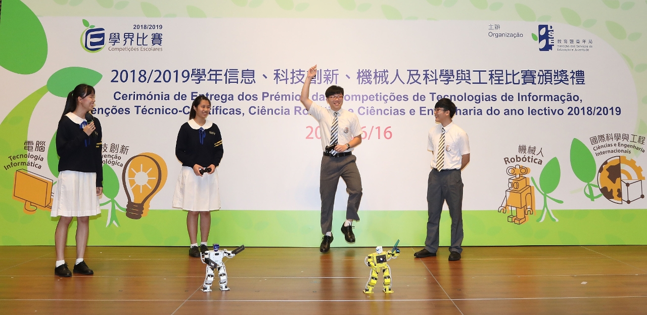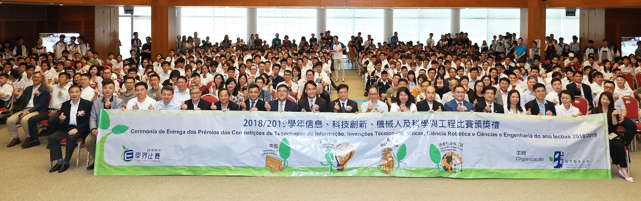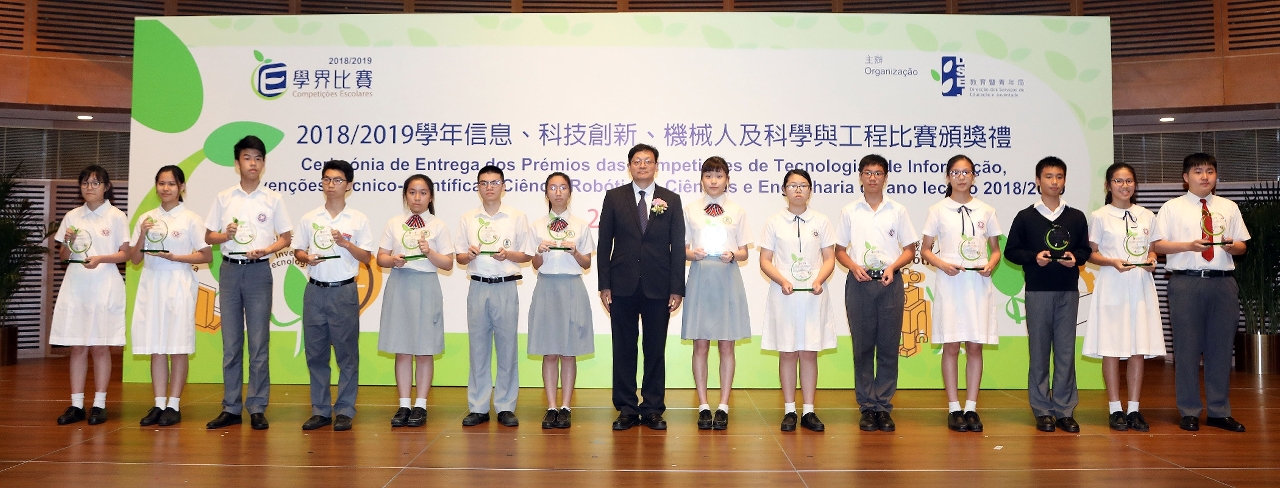 Para reconhecer os esforços dos estudantes premiados nos quatro concursos escolares de generalização dos conhecimentos científicos, a DSEJ realizou, no dia 16 de Junho, no Centro de Convenções do Centro de Ciência de Macau, a “Cerimónia de Entrega dos Prémios das Competições de Tecnologias de Informação, Invenções Técnico-Científicas, Ciência Robótica e Ciências e Engenharia do ano lectivo 2018/2019”.