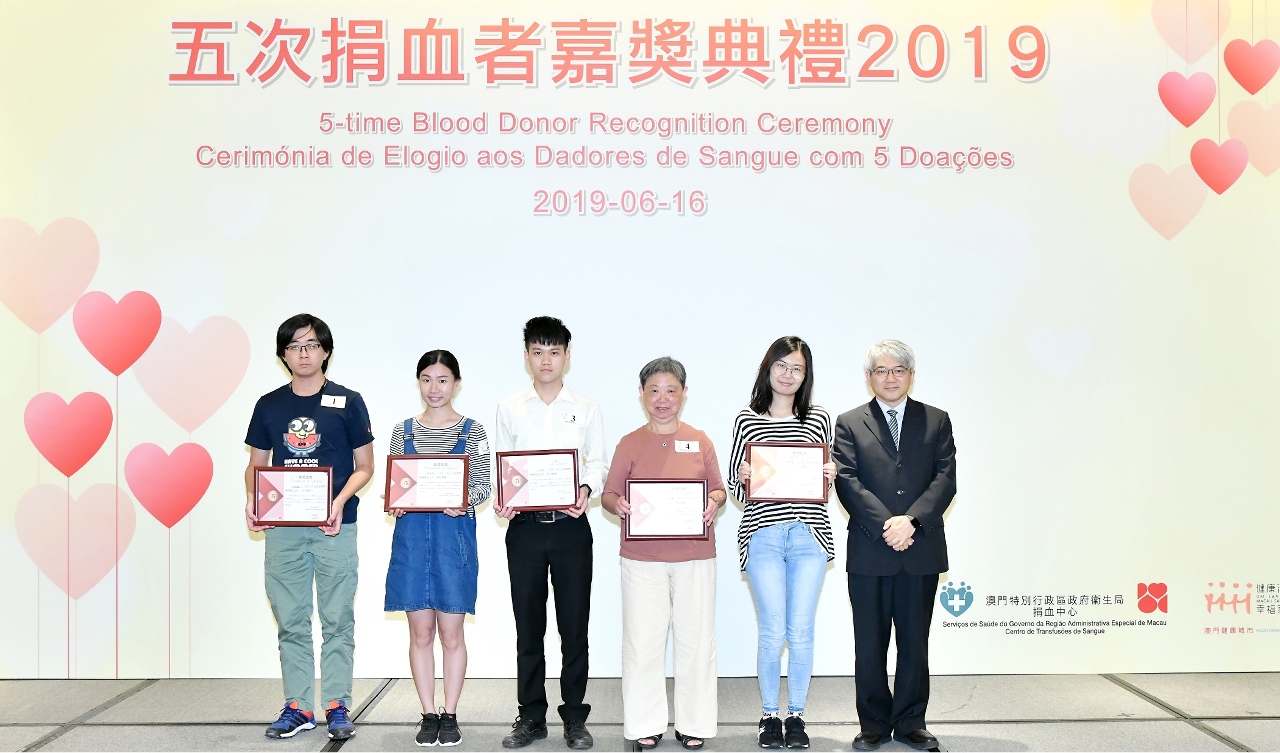 Para assinalar o “Dia Mundial do Dador de Sangue” de 2019, o Centro de Transfusões de Sangue dos Serviços de Saúde, Domingo, 16 de Junho, organizou uma cerimónia para a qual convidou 776 dadores de Sangue que já efectuaram 5 (cinco) doações em 2018 e na qual mais de 300 dadores e suas famílias participaram. A atribuição dos “Certificados de 5 doações de sangue” foi feita pelo Director dos Serviços de Saúde, Dr. Lei Chin Ion, pelos subdiectores, Dr. Cheang Seng Ip e Dr. Kuok Cheong U, pela Enfermeira Adjunta da Direcção, Dr.ª Chan Weng Sin e pela Directora do Centro de Transfusões de Sangue, Dr.ª Hui Ping, para agradecimento à contribuição de dadores para o sistema de saúde de Macau.
