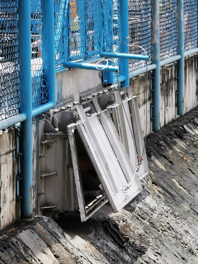 Por outro lado, a fim de evitar a obstrução da abertura da válvula pelo lixo de grandes dimensões, e ao mesmo tempo evitar a imigração ilegal, a abertura tem um gradeamento metálico. Cada conjunto de válvulas pesa aproximadamente 140 Kg, em caso de haver “Storm Surge” grave, a válvula mantém-se fechada pelo seu próprio peso e pela pressão da água do mar, em volta da abertura tem uma borda de borracha para reduzir a taxa de infiltração, impedindo efectivamente a entrada de água do mar no Porto Interior num curto espaço de tempo.