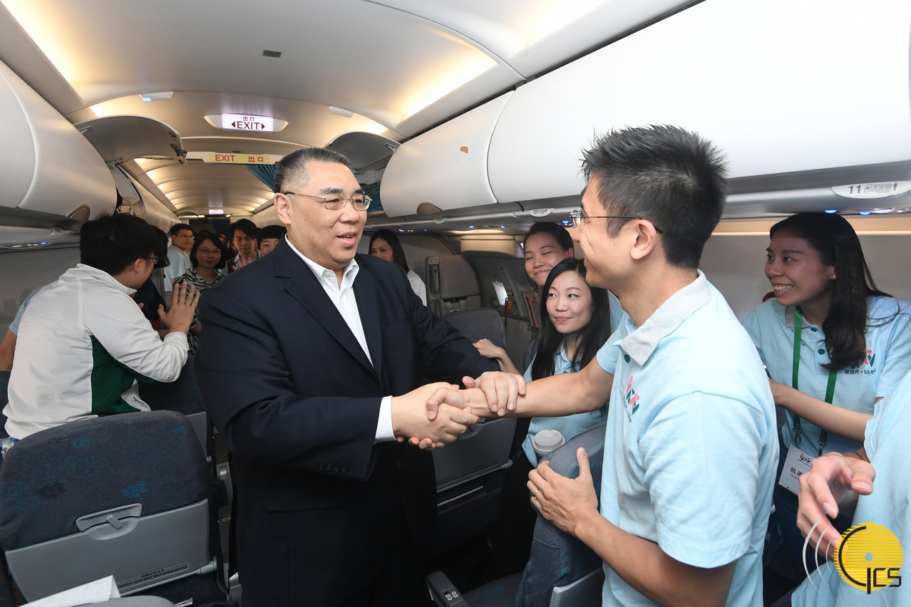 O Chefe do Executivo, Chui Sai On, cumprimentou pessoalmente, no avião, a cada um dos elementos da delegação, os quais aproveitaram, num ambiente animado e descontraído, a oportunidade para tirar fotografias e selfies com o Chefe do Executivo. O máximo responsável da Região Administrativa Especial de Macau (RAEM) conversou também cordialmente com estudantes do secundário que participaram na sessão de intercâmbio com os alunos de Hebei a frequentarem o mesmo grau de ensino, e elogiou ainda um destes jovens pelos seus dotes musicais.