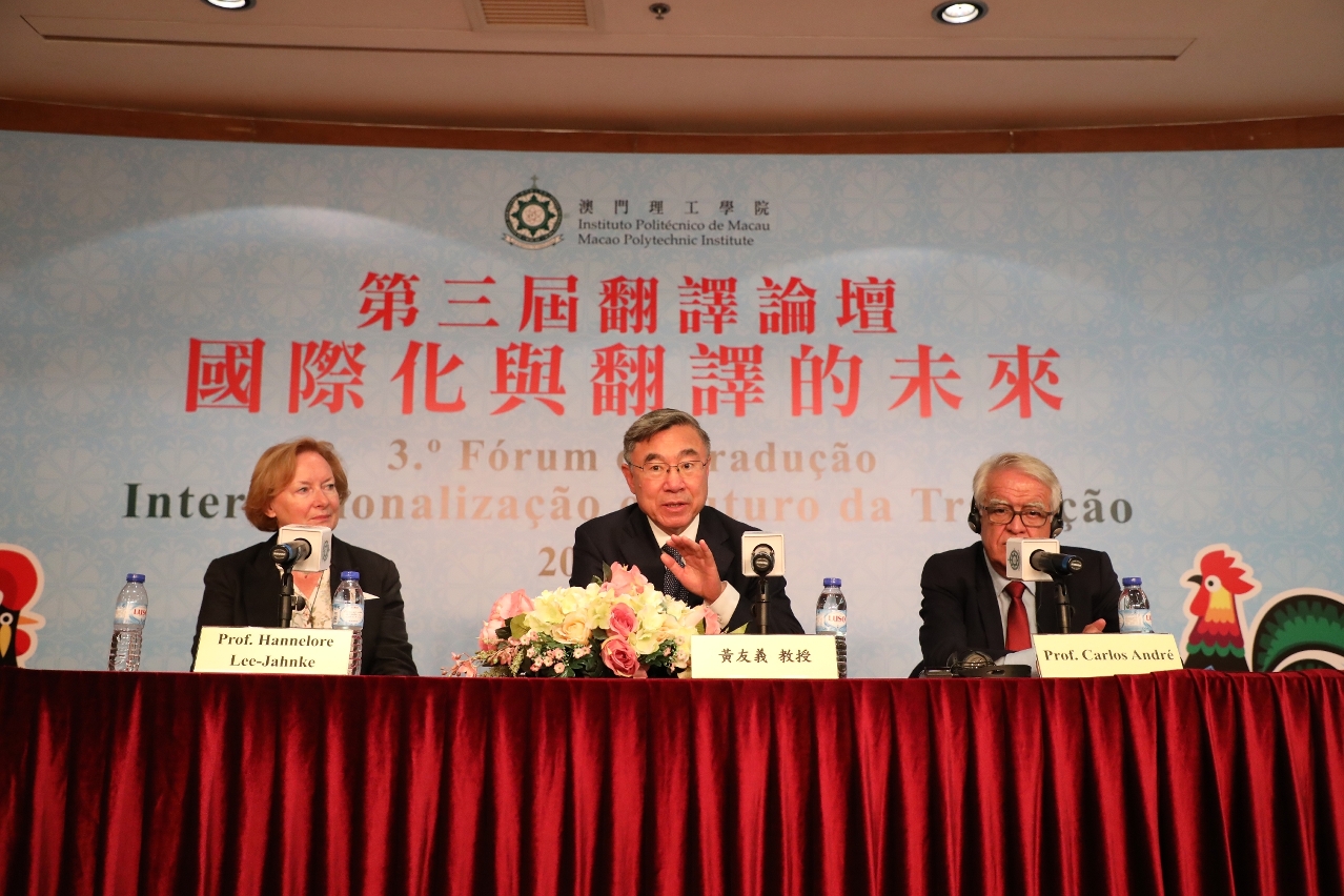 Durante o fórum, o Prof. Dr. Huang Youyi, Vice-Presidente Executivo da Associação de Tradutores da China e Ex-Vice-Director do Grupo de Publicações Internacionais da China (CIPG) fez uma intervenção subordinada ao tema “Nova era, nova necessidade e nova acção: missão para a educação do curso de tradução”, em que reflectiu profundamente sobre a missão e as necessidades enfrentadas pelos professores da área da tradução nesta nova era. A Profª. Drª. Hannelore Lee-Jahnke, Presidente honorária da Conferência Internacional Permanente de Institutos Universitários de Tradução e Interpretação (CIUTI) e Directora do Centro Multilingue da Universidade de Genebra, fez uma intervenção intitulada “Abordagem interdisciplinar: proposta de solução inovadora para os complexos desafios futuros”, na qual fez uma resenha histórica do desenvolvimento da tradução e discutiu os novos caminhos nesta área numa perspectiva “multidisciplinar”. Seguiu-se o Prof. Dr. Carlos André, que fez uma apresentação subordinada ao tema “Tradução literária: um processo de transformação complexo entre múlti-faces”, em que reflectiu sobre o estatuto especial da tradução literária, entendido como processo de transformação complexo que envolve diversos níveis, nomeadamente a linguagem do texto, a cultura e a sociedade. O discurso foi altamente proveitoso para a audiência.