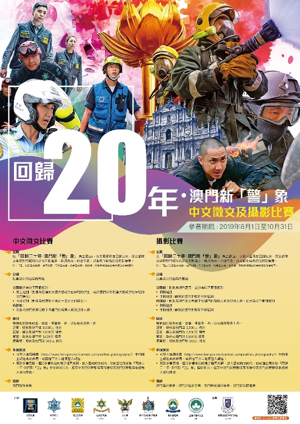Com vista à celebração do 20° Aniversário do Retorno de Macau à Pátria, à promoção da construção da cultura policial e ao estabelecimento da imagem moderna das forças de segurança, as forças e serviços de segurança continuam a organizar conjuntamente, no corrente ano, um concurso de composição em língua chinesa e um concurso de fotografia, ambos subordinados ao tema “20° Aniversário do Retorno de Macau à Pátria Nova Imagem da “Polícia” de Macau”, que visam demonstrar o novo estilo positivo e de popularidade que tem sido desenvolvido pelas forças e serviços de segurança desde o retorno de Macau à Pátria. As inscrições para os concursos terão início a partir de 1 de Agosto de 2019 até 31 de Outubro de 2019, sendo bem-vinda a participação de todos os cidadãos.