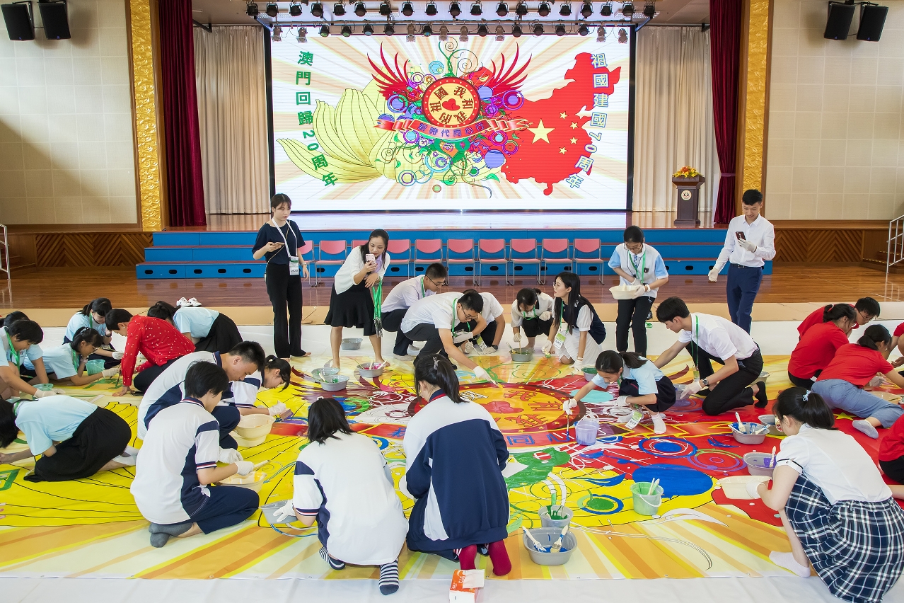 Todos os alunos pintaram um painel de 32 metros quadrados, uma bela mensagem e desejos de sucesso pela passagem do 20º aniversário do Regresso de Macau à Pátria e o 70º aniversário da implantação da RPC.
