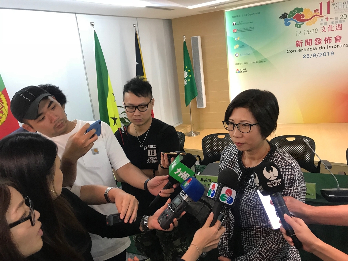 A 11ª Semana Cultural da China e dos Países de Língua Portuguesa, organizada pelo Secretariado Permanente do Fórum para a Cooperação Económica e Comercial entre a China e os Países de Língua Portuguesa (Macau), será realizada entre os dias 12 e 18 de Outubro de 2019. O evento contará com 5 actividades de relevo, nomeadamente Espectáculos de Música e Dança de Artistas da China e dos Países de Língua Portuguesa, Exposições de Artes Plásticas dos Artistas da China e dos Países de Língua Portuguesa, Mostra de Teatro dos Países e Regiões da Língua Portuguesa, Feira de Artesanato da China e dos Países de Língua Portuguesa, bem como os “Sabores do Mundo” dos Países de Língua Portuguesa. Para o efeito, o organizador deste evento, o Secretariado Permanente do Fórum de Macau, realizou uma Conferência de Imprensa no dia 25 de Setembro na Sala Multifuncional, que contou com a participação do Secretariado-Geral Adjunto, Dr. Rodrigo Brum e a Coordenadora do Gabinete de Apoio, Dr.ª Mok Iun Lei, os quais apresentaram os métodos de preparação desta edição.