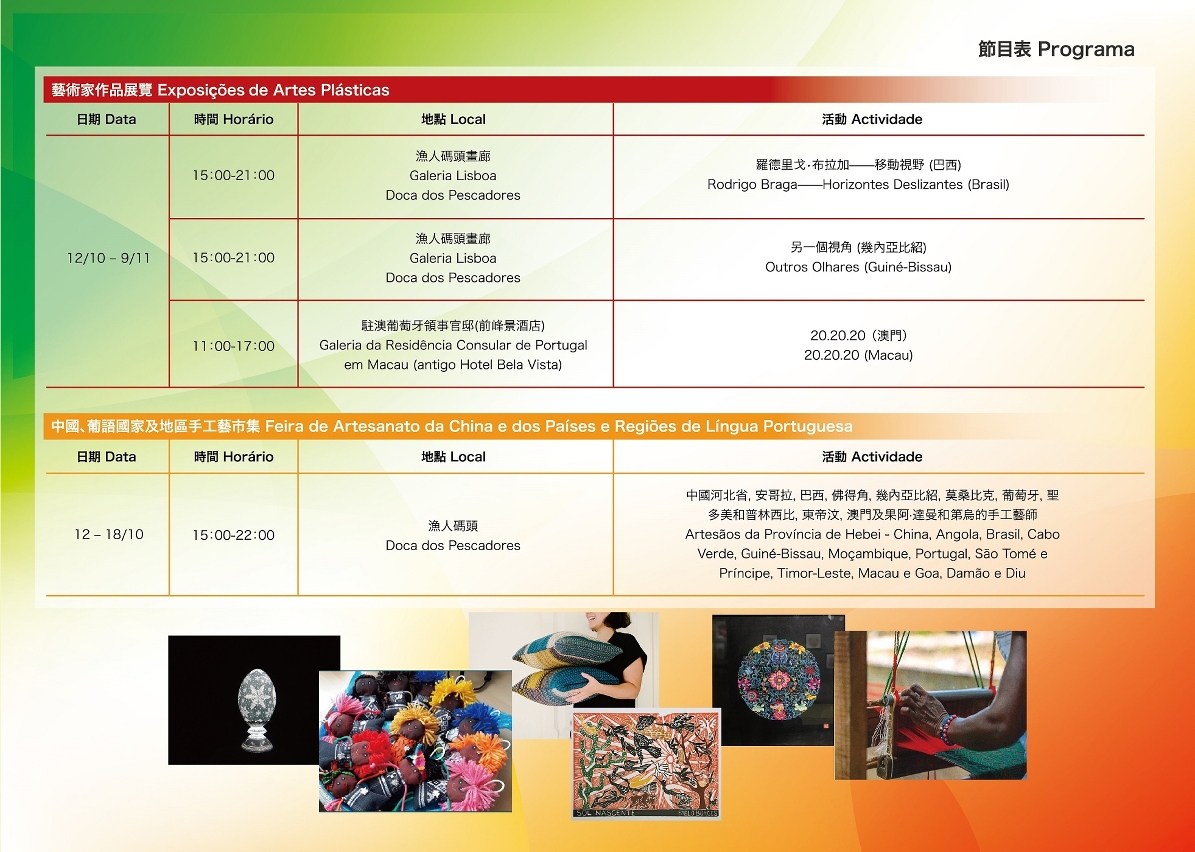 • Na “Exposições de Artes Plásticas dos Artistas da China e dos Países de Língua Portuguesa” serão exibidas obras notáveis dos artistas do Brasil e da Guiné-Bissau na Doca dos Pescadores. Também na Galeria da Residência Consular de Portugal em Macau, estarão expostas as obras de vinte jovens artistas de Macau, oferecendo aos residentes de Macau uma experiência única de artes visuais.
