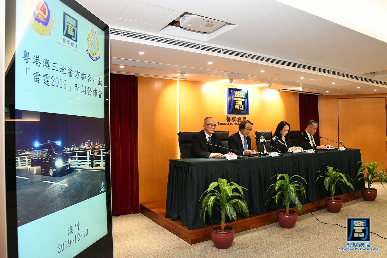 Realizou-se, hoje (dia 10 de Dezembro), pelas 15h00, em simultâneo com as autoridades policiais de Guangdong, Hong Kong e Macau, a conferência de imprensa sobre o balanço da Operação “Trovoada 2019”. A conferência em Macau teve lugar nos Serviços de Polícia Unitários (SPU) e foi presidida pelo Adjunto do Comandante-geral dos SPU, João Augusto da Rosa, com a presença da Adjunta do Director-geral dos Serviços de Alfândega (SA), Chau Kin Oi, Subdirector da Polícia Judiciária (PJ), Chan Kin Hong e Segundo-comandante do Corpo de Polícia de Segurança Pública (CPSP), Leong Heng Hong.