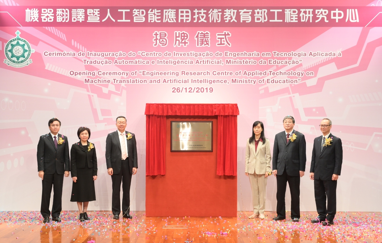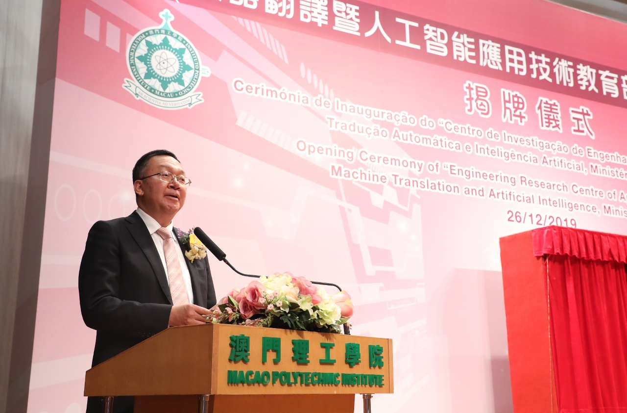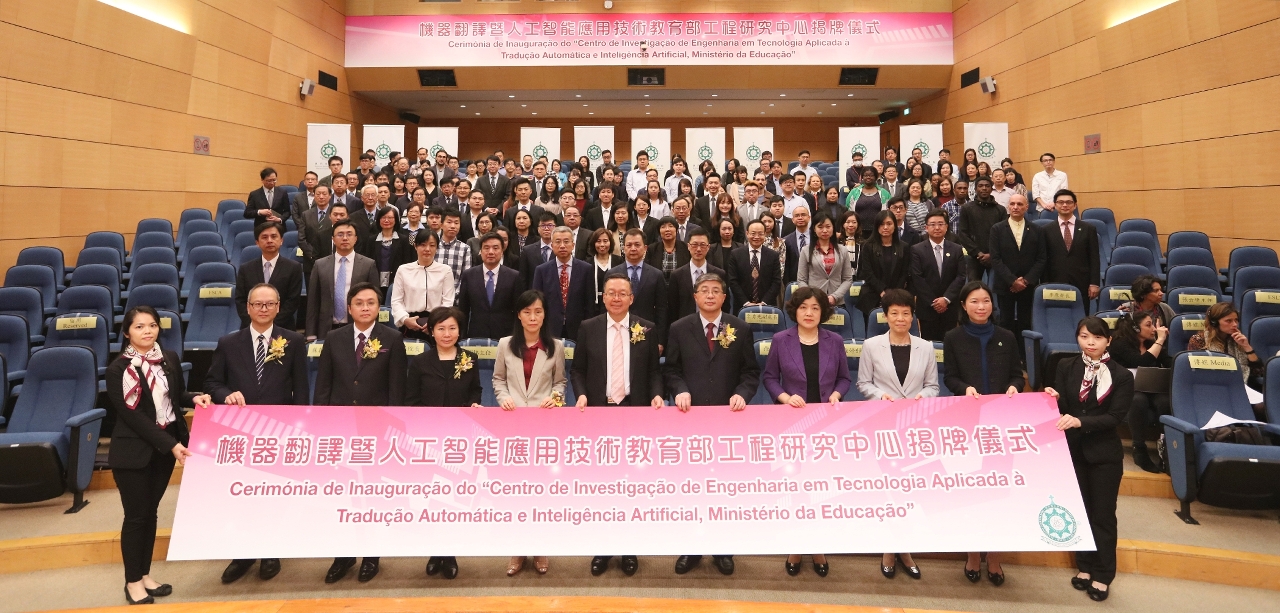 Este ano celebra-se o 70.º Aniversário da Fundação da República Popular da China e o 20.º Aniversário do Retorno de Macau à Pátria. Nesta ocasião de dupla celebração, o Instituto Politécnico de Macau (IPM), com o forte apoio do Governo da Região Administrativa Especial de Macau (RAEM) e do Gabinete de Ligação do Governo Popular Central na RAEM, foi oficialmente autorizado, pelo Ministério da Educação da República Popular da China (RPC), a estabelecer o “Centro de Investigação de Engenharia em Tecnologia Aplicada à Tradução Automática e Inteligência Artificial, Ministério da Educação”. A grandiosa cerimónia de inauguração deste Centro realizou-se no dia 26 de Dezembro, às 15:00, no Auditório do IPM, e contou com a presença dos seguintes convidados de honra: Vice-Ministro da Educação e Presidente da Comissão Linguística da RPC, Dr. Tian Xuejun, Secretária para os Assuntos Sociais e Cultura do Governo da RAEM, Dra. Ao Ieong U, Subdirector do Gabinete de Ligação do Governo Popular Central na RAEM, Dr. Luo Yonggang, Directora do Gabinete para os Assuntos Hong Kong, Macau e Taiwan do Ministério da Educação, Dra. Liu Jin, Director da Direcção dos Serviços do Ensino Superior do governo da RAEM, Dr. Sou Chio Fai e Presidente do Instituto Politécnico de Macau, Prof. Doutor Im Sio Kei. Estiveram ainda presentes na Cerimónia de Inauguração a Directora do Departamento de Aplicação e Administração Linguística do Ministério da Educação, Dra. Xu Xiaoping, o Subdirector do Departamento de Pessoal, Dr. Lv Jie, o Subdirector do Departamento de Políticas e Regulamentações, Dr. Wang Daquan, representantes de diversas associações sociais de Macau, docentes, alunos e ex-alunos do IPM, num total de cerca de 200 pessoas.