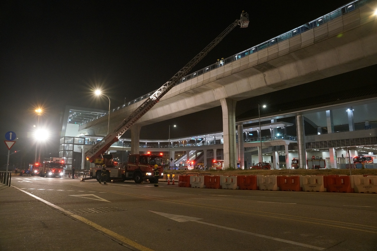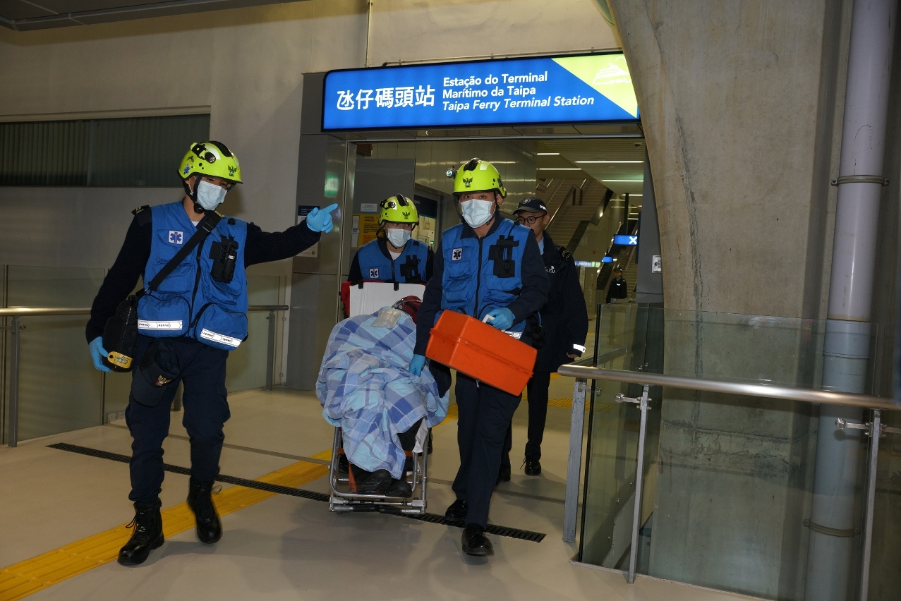 O exercício simulou haver fumo leve na primeira carruagem do metro ligeiro, que transportava muitos passageiros na saída da Estação Terminal Marítimo da Taipa e ida para a Estação Aeroporto, em simultâneo, o metro ligeiro perdeu a força motriz, os trabalhadores do metro ligeiro ligaram imediatamente ao CB para pedir o auxílio, activaram os planos de emergência e contingência, procederam à evacuação de emergência dos passageiros daquele metro ligeiro e os empregados que se encontraram no local ajudaram os passageiros a andarem a pé, de modo a regressar à Estação Terminal Marítimo da Taipa e evacuar para o lugar seguro. Após a recepção da chamada, esta Corporação enviou veículos de emergência e pessoal conforme os respectivos planos, depois da chegada dos bombeiros ao local, entraram na carruagem acima mencionada para desenvolver as acções de salvamento, colocar as escadas da auto-escada para realizar a prevenção e os socorristas procederam à enfermagem preliminar junto dos feridos e transportaram os mesmos para o hospital.