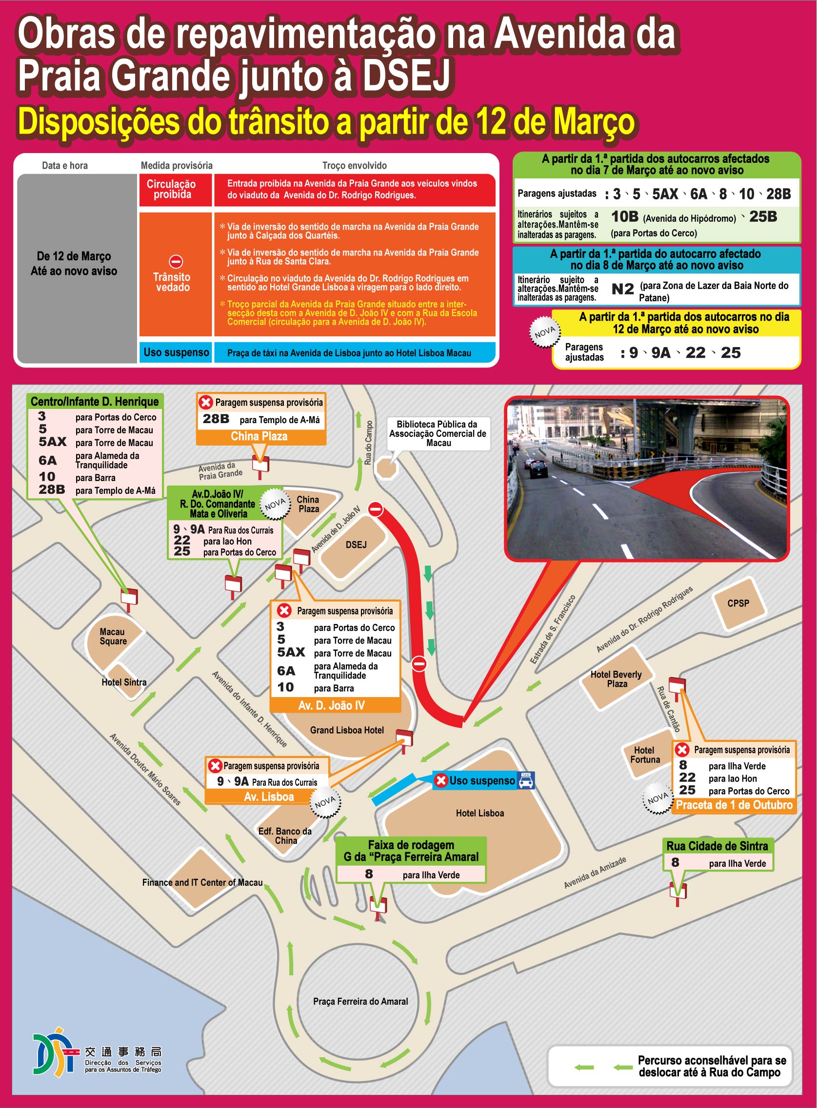 Na sequência do facto de o Instituto para os Assuntos Municipais (IAM) ter dado início às obras de repavimentação e manutenção de esgotos na Avenida da Praia Grande junto à Direcção dos Serviços de Educação e Juventude (DSEJ), a Direcção dos Serviços para os Assuntos de Tráfego (DSAT), após inspecção, in loco, à execução das obras verificou que o trânsito se encontrava geralmente fluído, porém, mais congestionado nas horas de ponta. Tendo em conta as disposições relativas ao regresso às aulas por parte dos alunos do ensino não superior, por forma a acelerar a execução das obras, o IAM e a DSAT decidiram proceder, a partir de 12 de Março, à aplicação de novas disposições, com vista a que as obras possam ser concluídas no final de Abril.