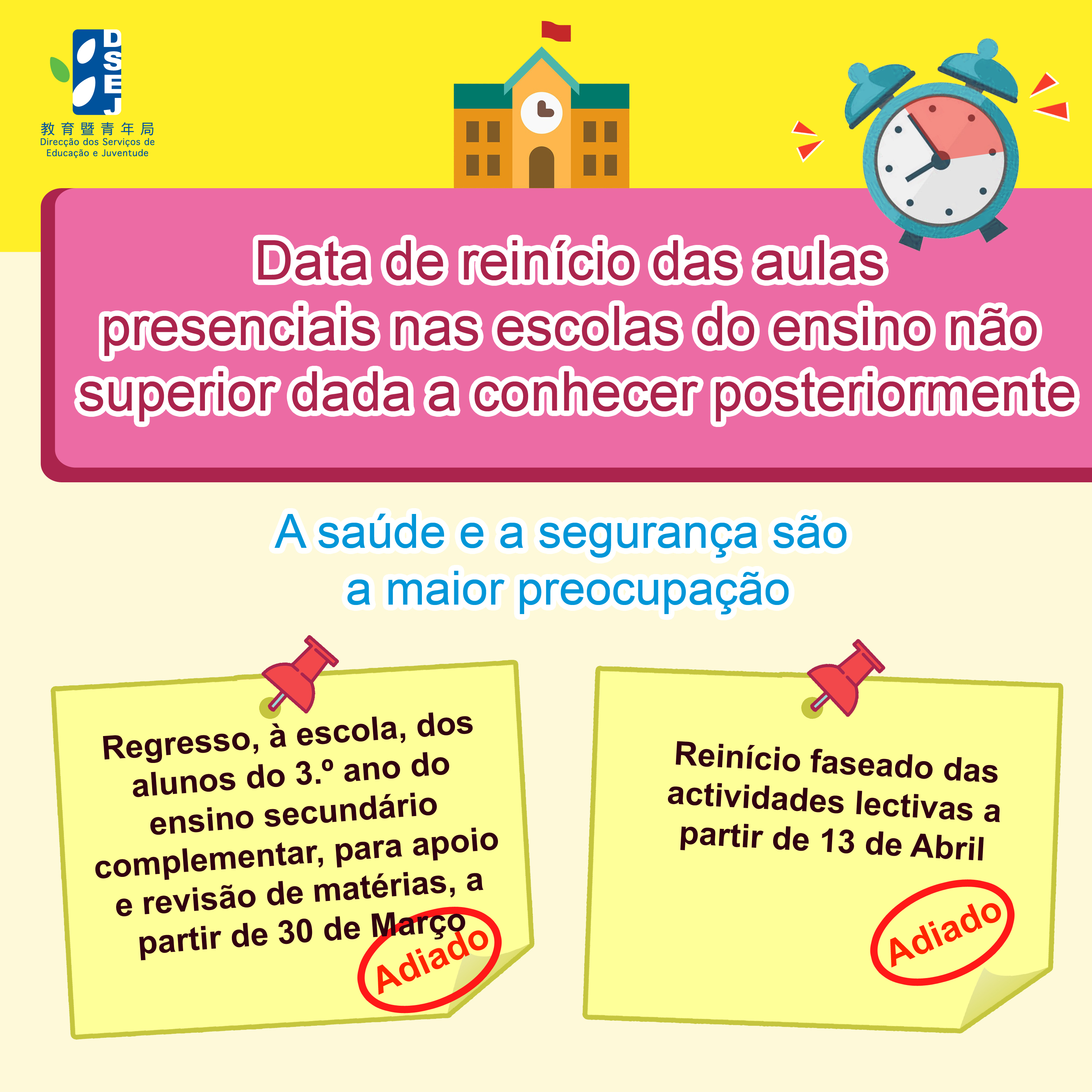 A saúde e a segurança são a maior preocupação, das autoridades, no que respeita ao reinício das actividades lectivas nas escolas. Devido à evolução da epidemia, conforme os pareceres das autoridades de saúde, em linha com a avaliação continuada da influência dos casos recentemente importados e a situação das pessoas que regressam a Macau, a organização original feita para o ensino não superior, que considerava a possibilidade de regresso, à escola, dos alunos do 3.º ano do ensino secundário complementar, para apoio e revisão de matérias, a partir de 30 de Março, e o reinício faseado das actividades lectivas a partir de 13 de Abril, será alterada. O Governo vai continuar a fiscalizar e a analisar, continuadamente, o desenvolvimento da epidemia e, com base em provas científicas e nos pareceres das autoridades de saúde, procederá ao ajustamento do plano de reinício das aulas presenciais, cuja data concreta será dada a conhecer posteriormente.