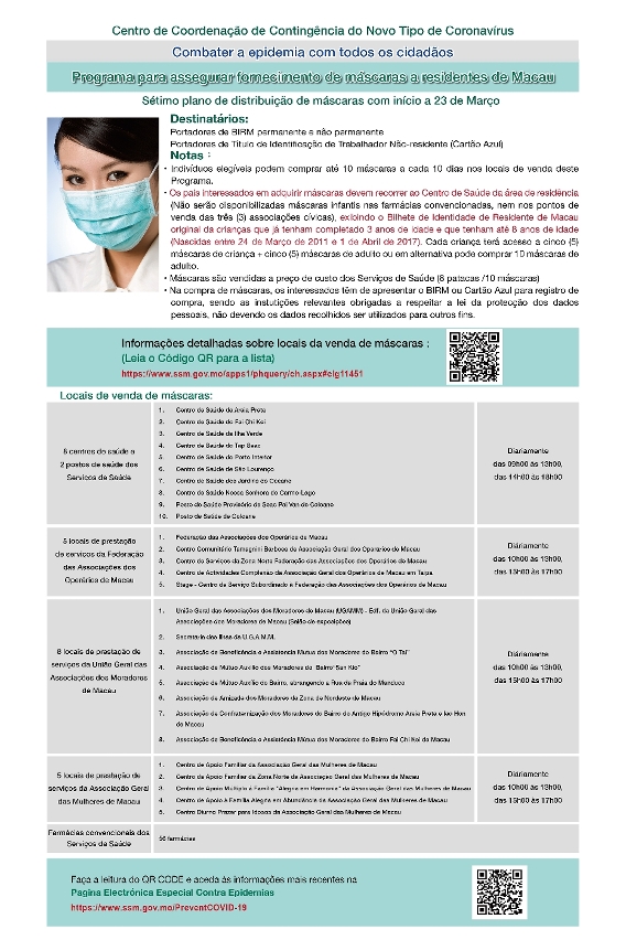 O Centro de Coordenação de Contingência do Novo Tipo de Coronavírus inicia segunda‑feira, 23 de Março, o 7.º plano de fornecimento de máscaras aos residentes de Macau. Os residentes devem agendar o momento de compra das máscaras de acordo com suas necessidades e de acordo com o número de máscaras que ainda possua.