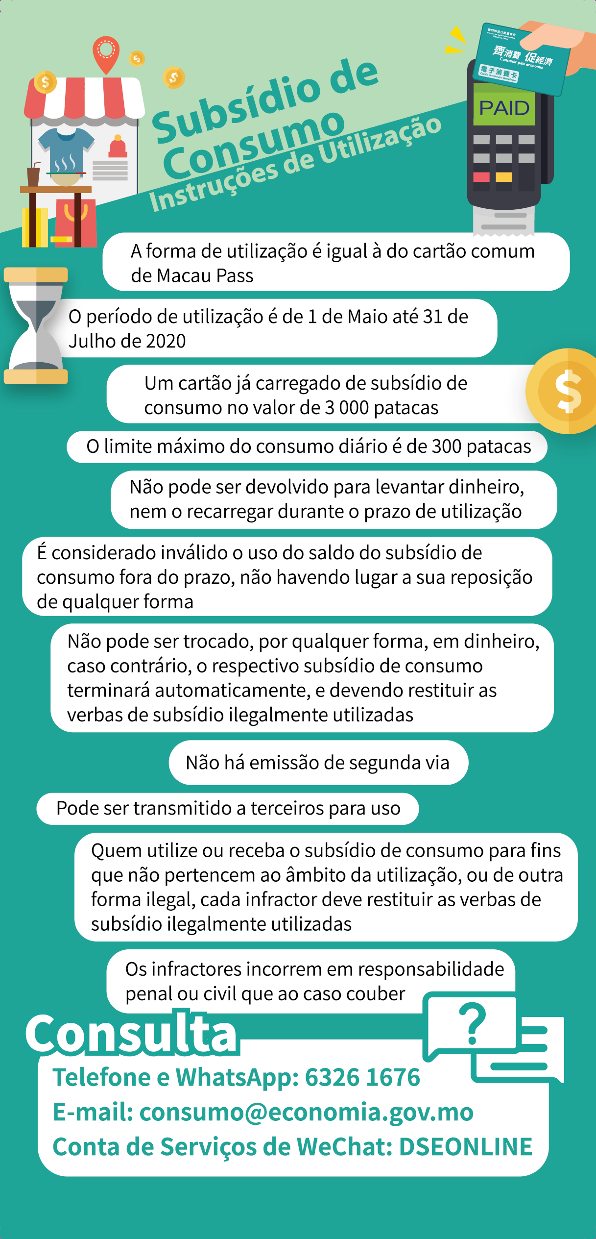 Nos termos do disposto no Regulamento Administrativo n.º 6/2020 (Plano de subsídio de consumo), o cartão de consumo electrónico apenas pode ser utilizado para aquisição de produtos ou serviços, não podendo ser trocado, por qualquer forma, em dinheiro. Caso contrário, o uso dos respectivos cartões de consumo electrónicos ficará terminado e os infractores deverão restituir as verbas ilegalmente utilizadas e incorrer em responsabilidade penal ou civil que ao caso couber. Os cidadãos podem apresentar denúncia junto da Direcção do Serviços de Economia se se verificar a existência de irregularidades.