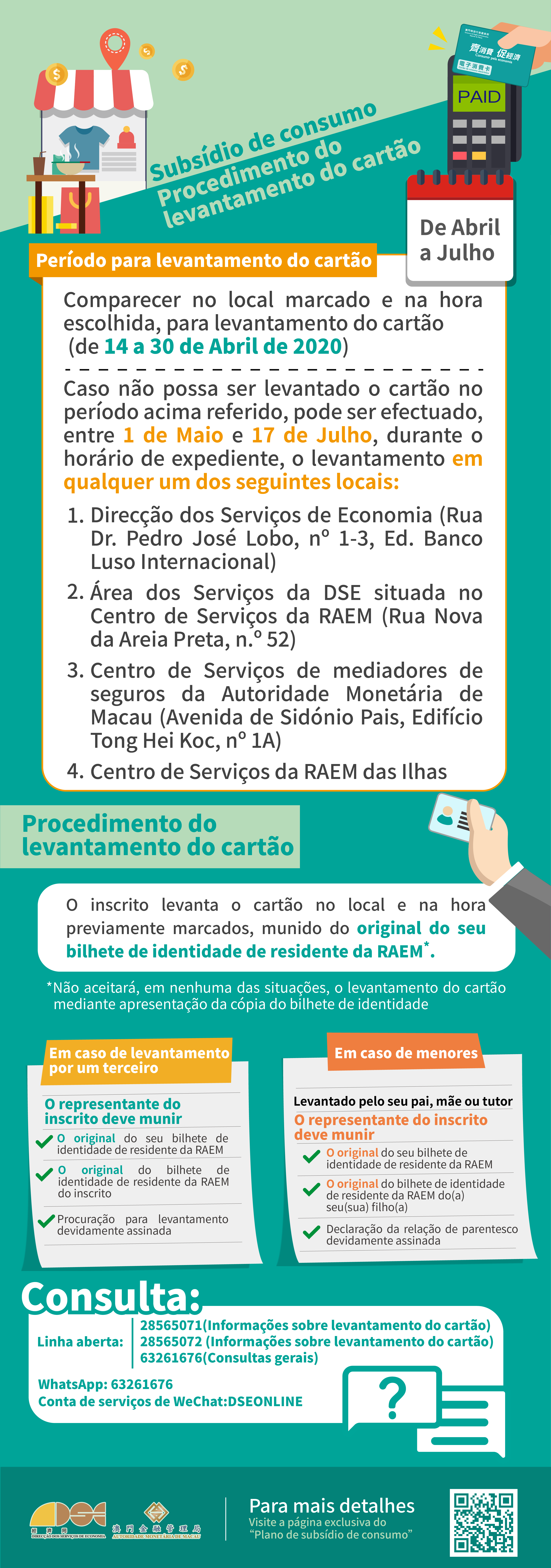 Após a consideração desta possibilidade, Governo da RAEM decidiu lançar a medida especial relativa ao prolongamento de período de levantamento do cartão em causa até ao dia 17 de Julho (isto é, este período decorre entre 14 de Abril e 17 de Julho), mantendo inalterado o período de utilização entre 1 de Maio e 31 de Julho.