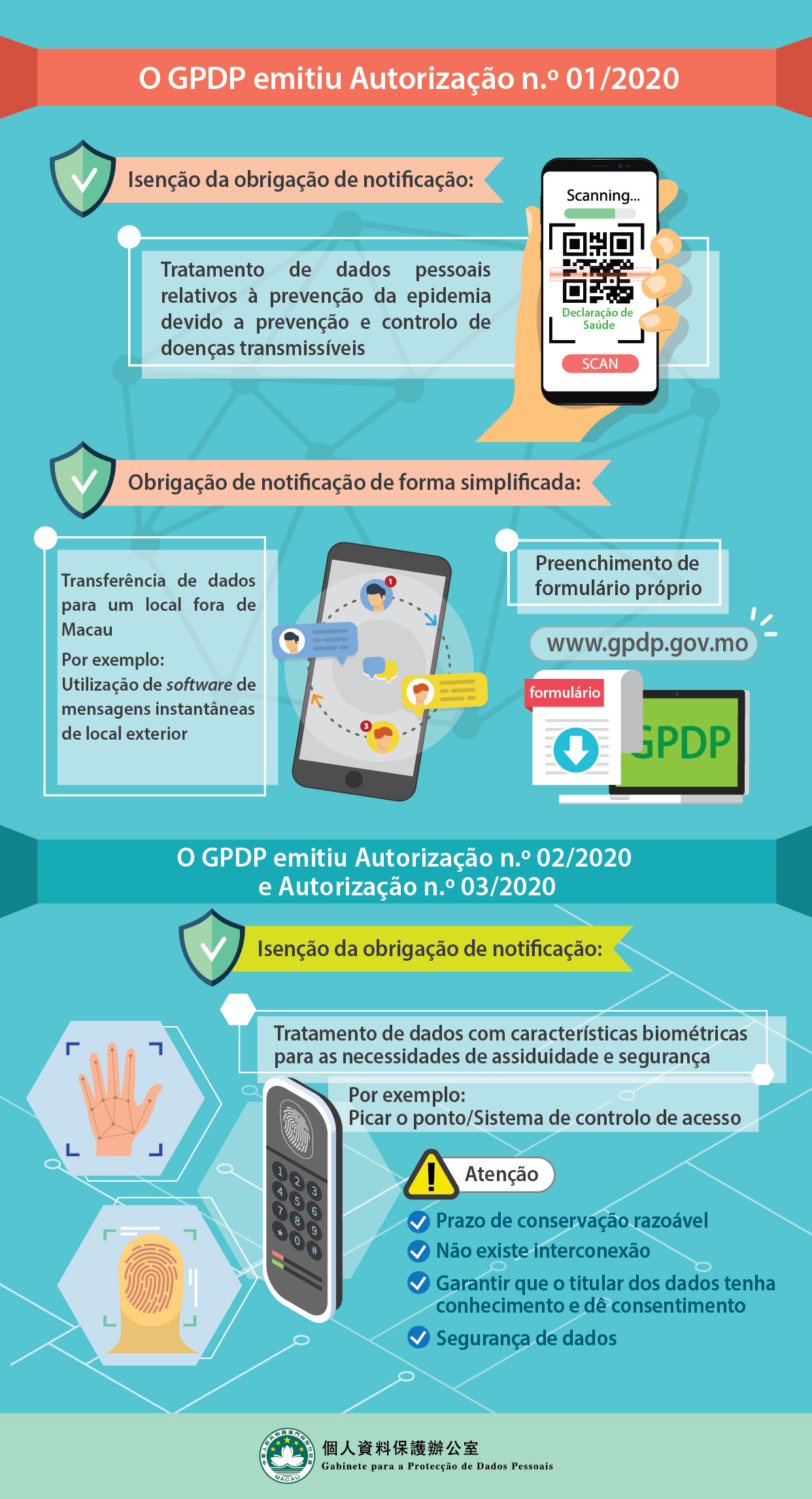 Considerando a extensão dos trabalhos da prevenção e do controlo da referida epidemia e baseando nos princípios convenientes, económicos e eficazes, o GPDP emitiu a Autorização n.º 01/2020, Isenção da obrigação de notificação e cumprimento da obrigação de notificação de forma simplificada “Recolha e tratamento de dados pessoais das pessoas que entrem e saiam dos estabelecimentos com a finalidade de implementar medidas para a prevenção e o controlo de doenças transmissíveis”, e os seus efeitos retroagem ao dia 1 de Janeiro de 2020.