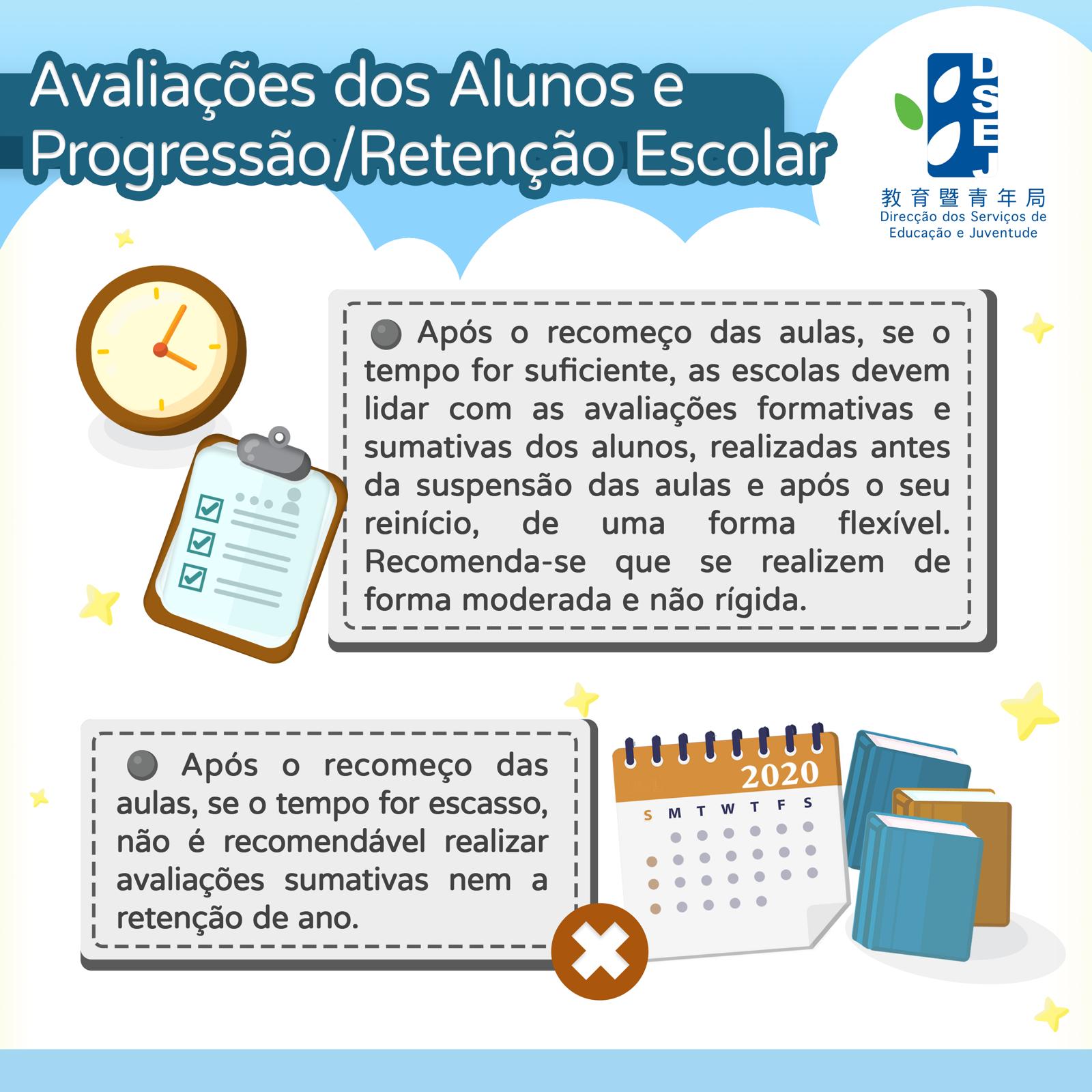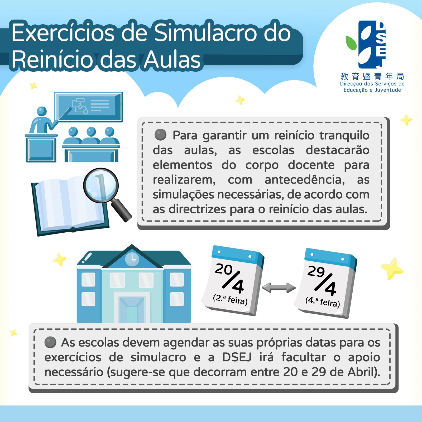 Para uma melhor preparação, a DSEJ formulou as Directrizes para o Reinício das Aulas, cujo conteúdo abrange as medidas de prevenção epidémica e para a saúde, ensino e aprendizagem, avaliação e progressão/retenção. Para assegurar um bom reinício das aulas, a DSEJ fornecerá apoio às escolas para a realização de exercícios de simulação, de acordo com as directrizes, para permitir a docentes e funcionários compreenderem os detalhes dos vários preparativos e dos planos de resposta para a retomada das aulas. Estas directrizes estarão disponíveis no site da DSEJ, para que as escolas possam preparar, da melhor forma possível, o reinício das aulas.