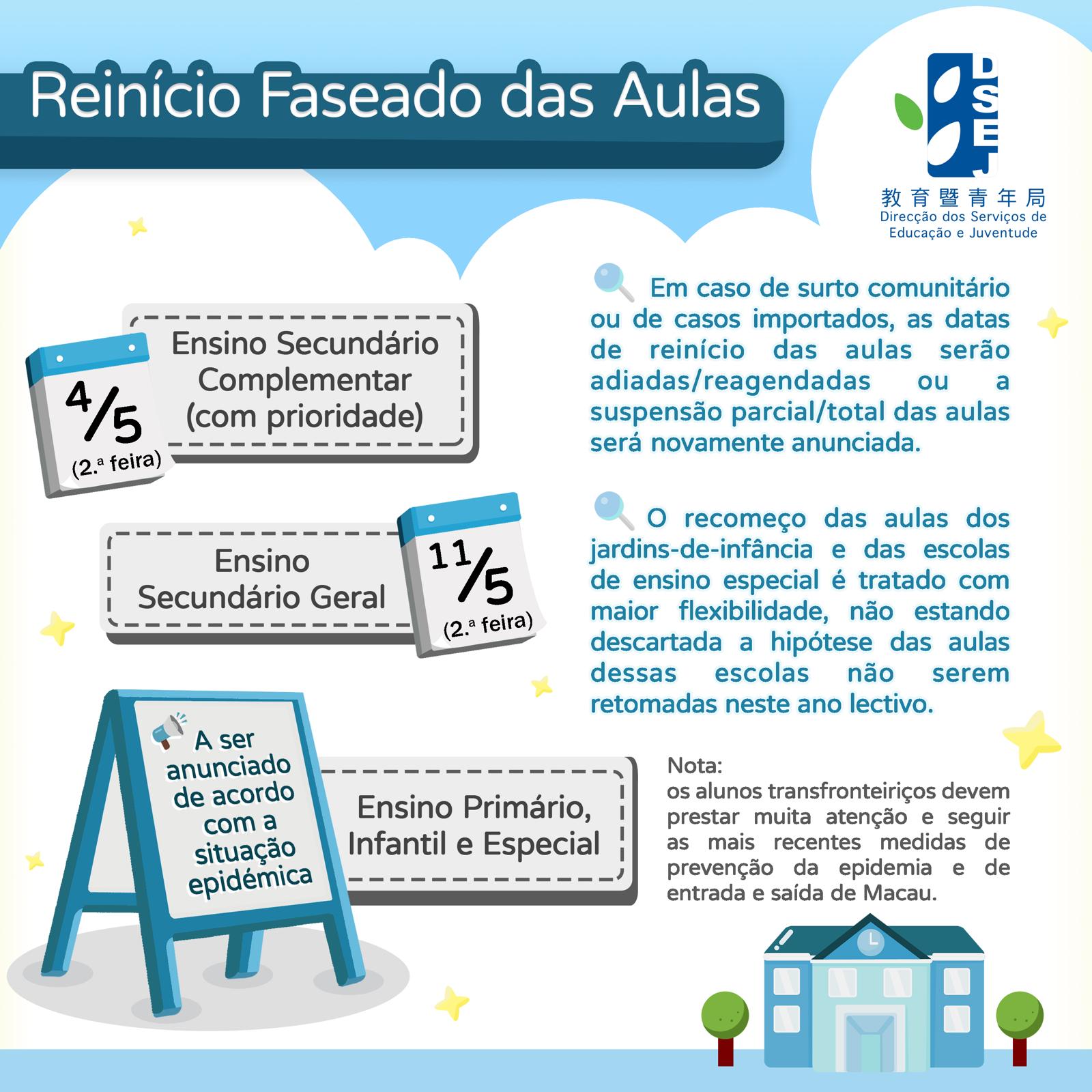 Tendo em consideração a actual situação em Macau e após auscultar os pareceres profissionais dos serviços de saúde, a DSEJ determinou que as escolas do ensino não superior retomarão as aulas no próximo mês de Maio (tabela abaixo). Neste sentido, pede aos docentes e alunos transfronteiriços que tenham muita atenção às medidas de prevenção epidémica e de entrada e saída de Macau, mais actualizadas, de modo a adequarem as suas deslocações.