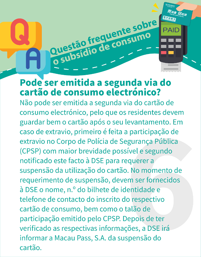 Não pode ser emitida a segunda via do cartão de consumo electrónico, pelo que os residentes devem guardar bem o cartão após o seu levantamento. Em caso de extravio, primeiro é feita a participação de extravio no Corpo de Polícia de Segurança Pública (CPSP) com maior brevidade possível e segundo notificado este facto à DSE para requerer a suspensão da utilização do cartão. No momento de requerimento de suspensão, devem ser fornecidos à DSE o nome, n.º do bilhete de identidade e telefone de contacto do inscrito do respectivo cartão de consumo, bem como o talão de participação emitido pelo CPSP. Depois de ter verificado as respectivas informações, a DSE irá informar a Macau Pass, S.A. da suspensão do cartão.