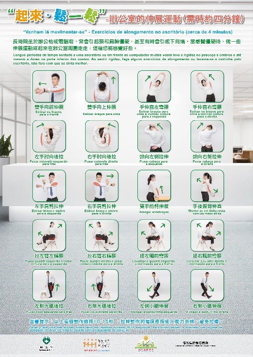 Ao mesmo tempo, A Comissão de Prevenção e Controlo das Doenças Crónicas apresentou também um exercício aeróbico fácil para todas as idades (link do vídeo: https://www.youtube.com/watch?v=gzxKD_3vjqs; ou Código QR do vídeo) e uma série de exercícios de alongamento no escritório de "Venham lá movimentar-se" , os residentes podem fazer exercícios físicos ou de alongamento em pequenos espaços (como em casa e escritório) com a ajuda de vídeos on-line e folhetos desportivos para ajudá-los a melhorar sua flexibilidade e capacidade física, a fim de atingir o efeito de aliviar o estresse da vida. Os folhetos desportivos relevantes podem ser obtidos gratuitamente por organizações ou pessoas interessadas. E-mail: ncdmacao@ssm.gov.mo; número de telefone de consulta de informações: 8504 1479.