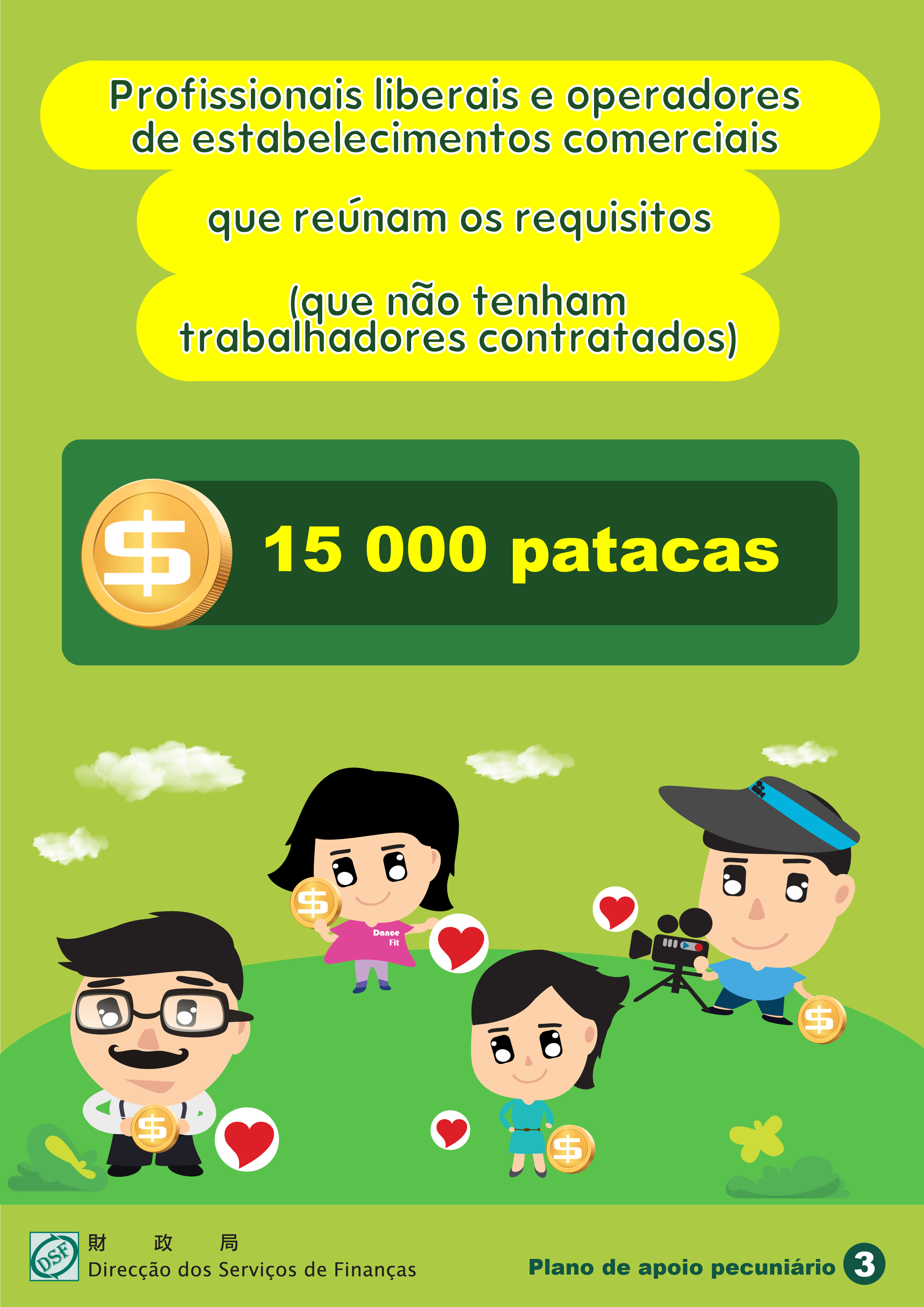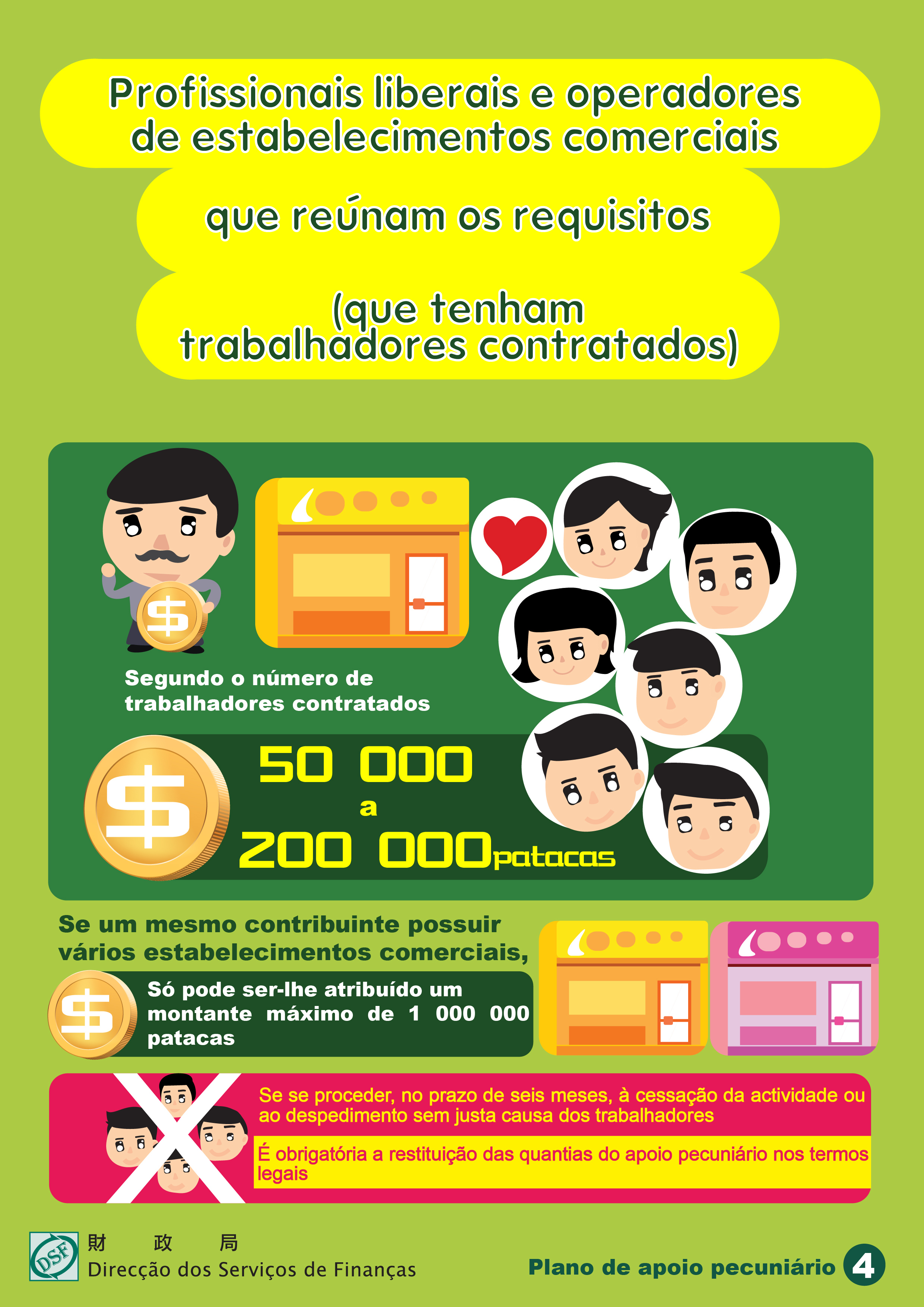 Nos termos do Regulamento Administrativo atrás citado, é atribuído um montante de: 15 000 patacas aos profissionais liberais e aos operadores de estabelecimentos comerciais, que não tenham trabalhadores contratados; 10 000 patacas aos profissionais liberais que se dediquem a sectores específicos; entre as 50 000 e as 200 000 patacas aos profissionais liberais e aos operadores de estabelecimentos comerciais, que tenham trabalhadores contratados.