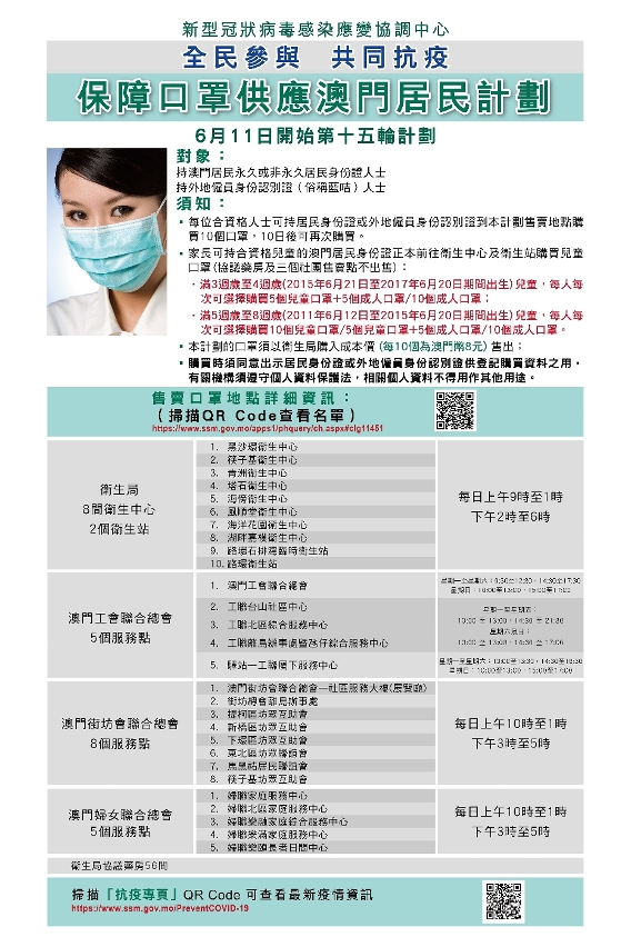O Centro de Coordenação de Contingência do Novo Tipo de Coronavírus inicia esta quinta‑feira, 11 de Junho, o 15.º plano de fornecimento de máscaras aos residentes de Macau.