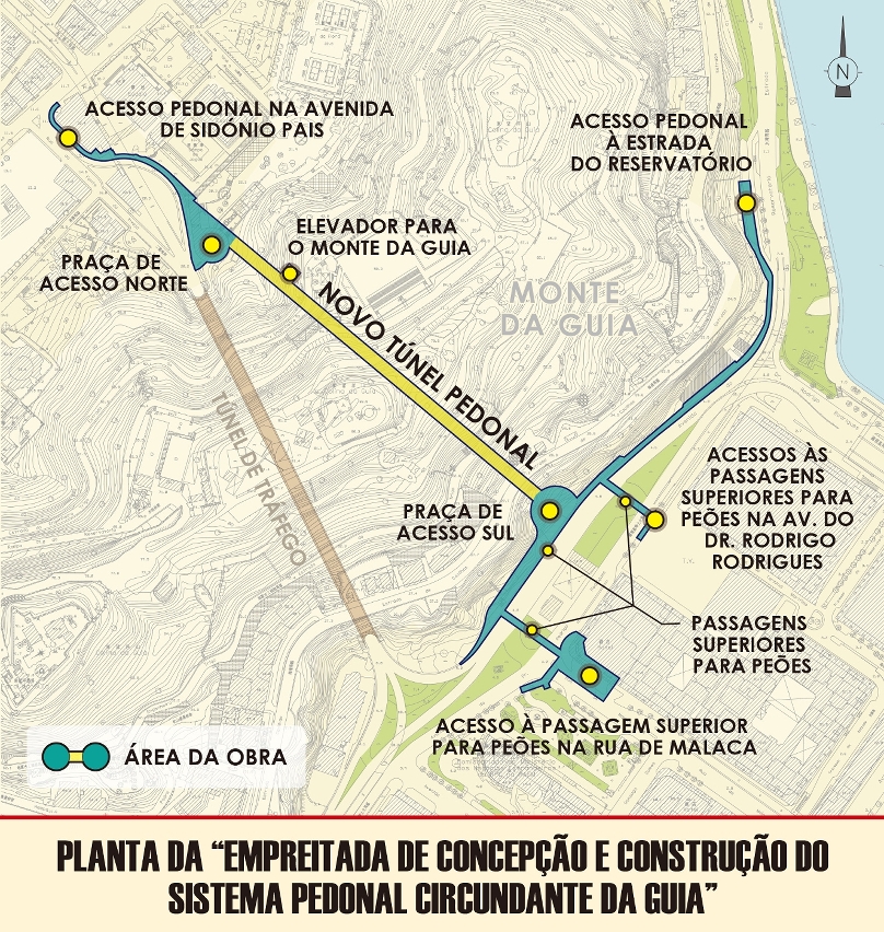 O túnel pedonal terá um acesso na Avenida do Dr. Rodrigo Rodrigues em frente do posto de combustíveis existente e outro junto à Ecoteca da Flora, ou seja, perto do acesso do Túnel da Guia. A obra, logo que concluída, irá permitir que o percurso pedonal entre estes dois locais que é de cerca de 1 100 metros seja atalhado para aproximadamente 400 metros. O túnel será equipado com um sistema automático de circulação pedonal e elevadores que dão acesso à Estrada do Engenheiro Trigo situada a meia encosta da Colina da Guia. Na extremidade do túnel, na Avenida do Dr. Rodrigo Rodrigues, serão construídas duas passagens superiores para peões que atravessarão a avenida, uma de ligação à Rua de Malaca e outra à via pública adjacente ao Silo Jai Alai e ao terreno onde actualmente se encontra um estaleiro devoluto. Este novo sistema pedonal será apetrechado com equipamentos sem barreiras arquitectónicas. Além disso, esta empreitada irá optimizar as condições de travessia pedonal da zona que abrange a Avenida do Dr. Rodrigo Rodrigues e a Estrada do Reservatório.