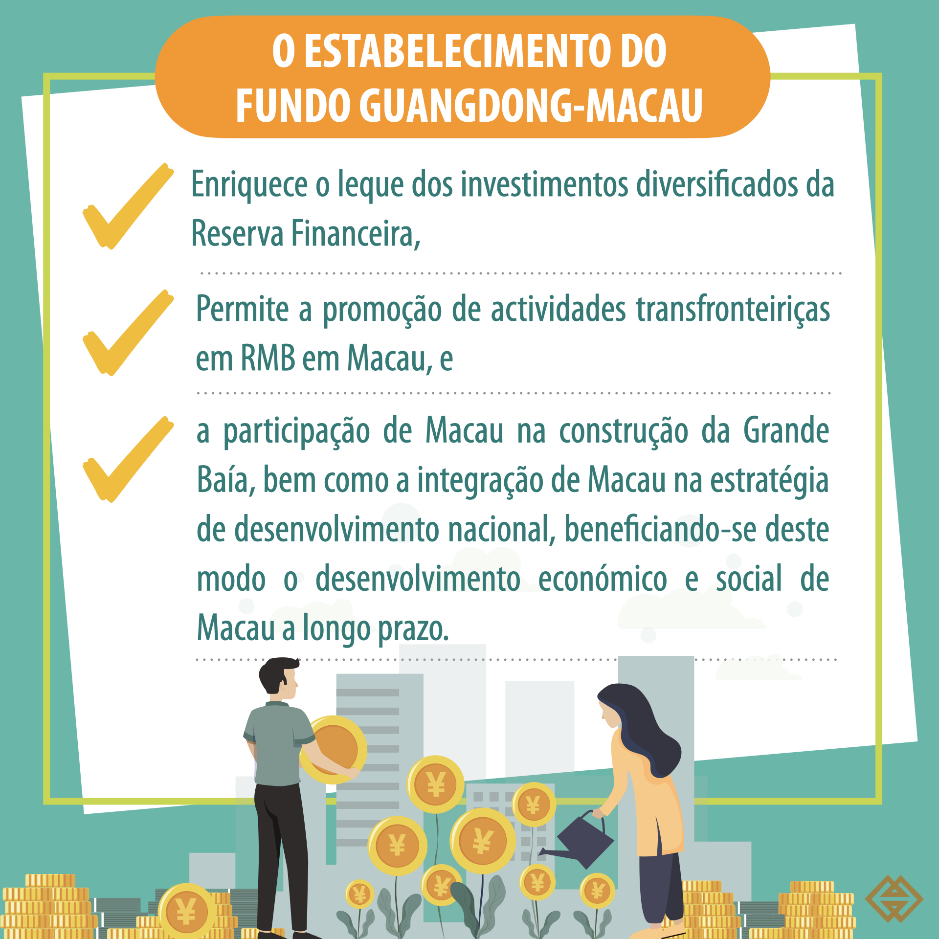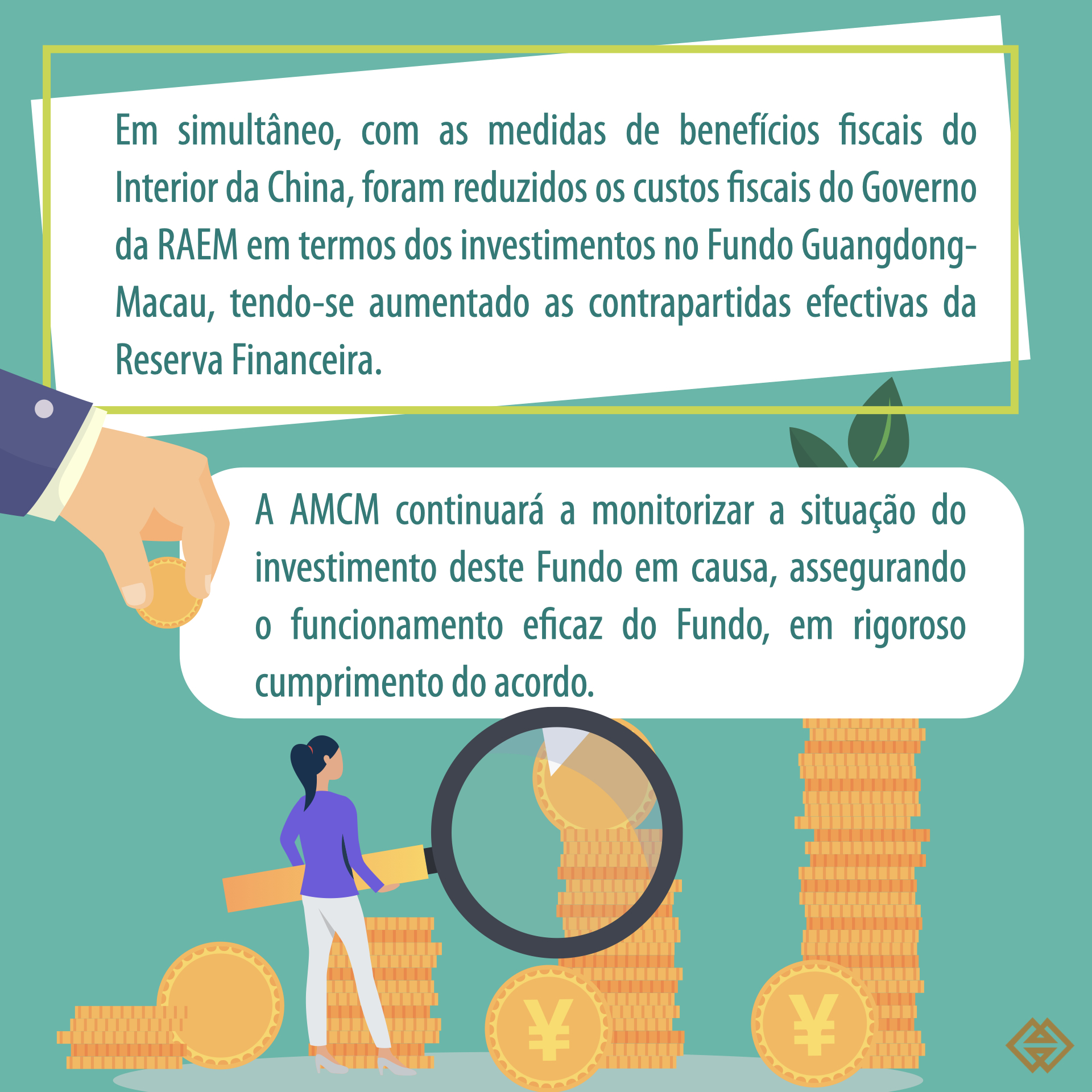 O estabelecimento do Fundo Guangdong-Macau, para além de enriquecer o leque dos investimentos diversificados da Reserva Financeira, permite também a promoção de actividades transfronteiriças em RMB em Macau, a participação de Macau na construção da Grande Baía, bem como a integração de Macau na estratégia de desenvolvimento nacional, beneficiando-se deste modo o desenvolvimento económico e social de Macau a longo prazo. Em simultâneo, com as medidas de benefícios fiscais do Interior da China, foram reduzidos os custos fiscais do Governo da RAEM em termos dos investimentos no Fundo Guangdong-Macau, tendo-se aumentado as contrapartidas efectivas da Reserva Financeira. A AMCM continuará a monitorizar a situação do investimento deste Fundo em causa, assegurando o funcionamento eficaz do Fundo, em rigoroso cumprimento do acordo.