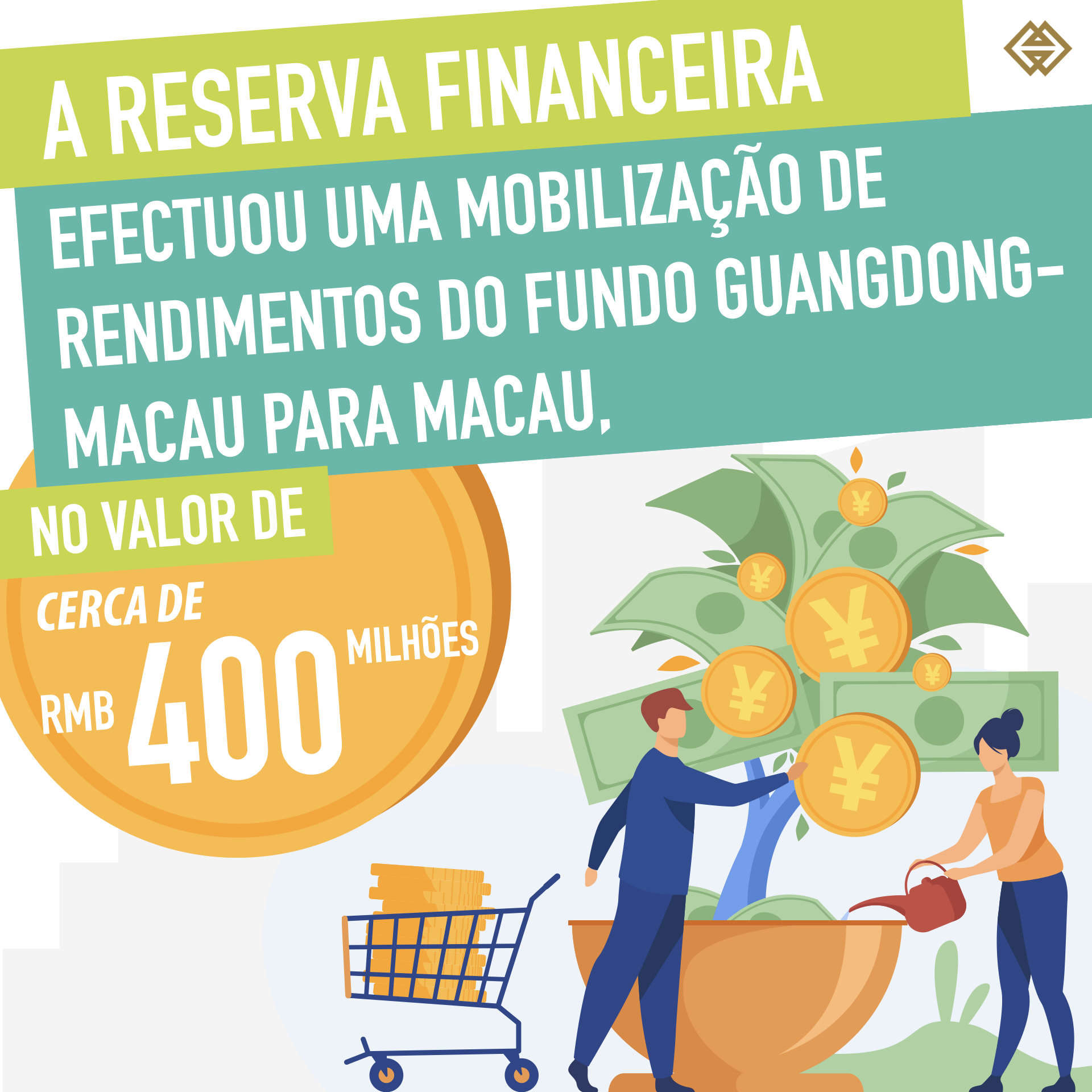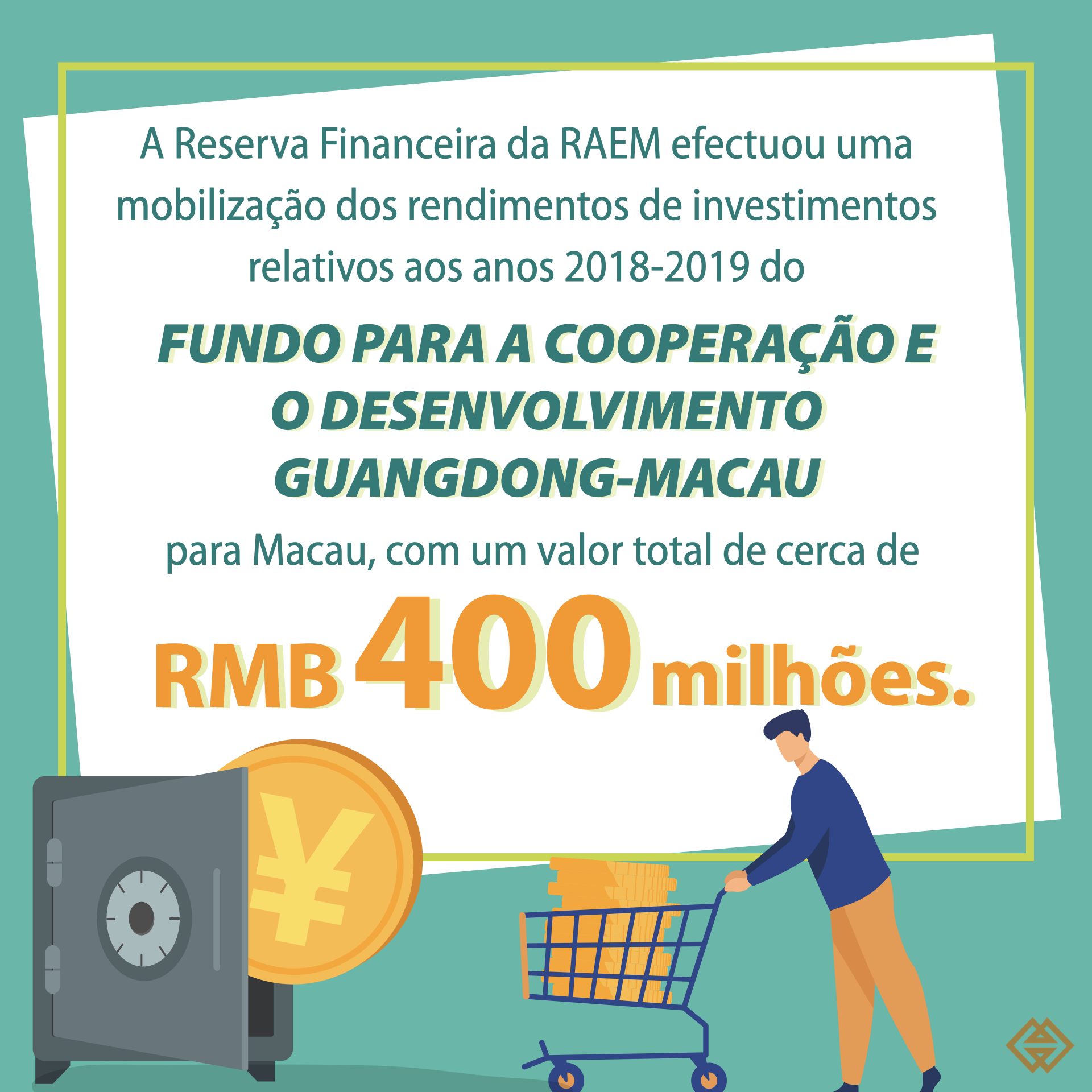 A Reserva Financeira da Região Administrativa Especial de Macau efectou uma mobilização dos rendimentos de investimentos relativos aos anos 2018-2019 do Fundo para a Cooperação e o Desenvolvimento Guangdong-Macau (adiante designado por “Fundo Guangdong-Macau”) para Macau, com um valor total de cerca de RMB400 milhões.
