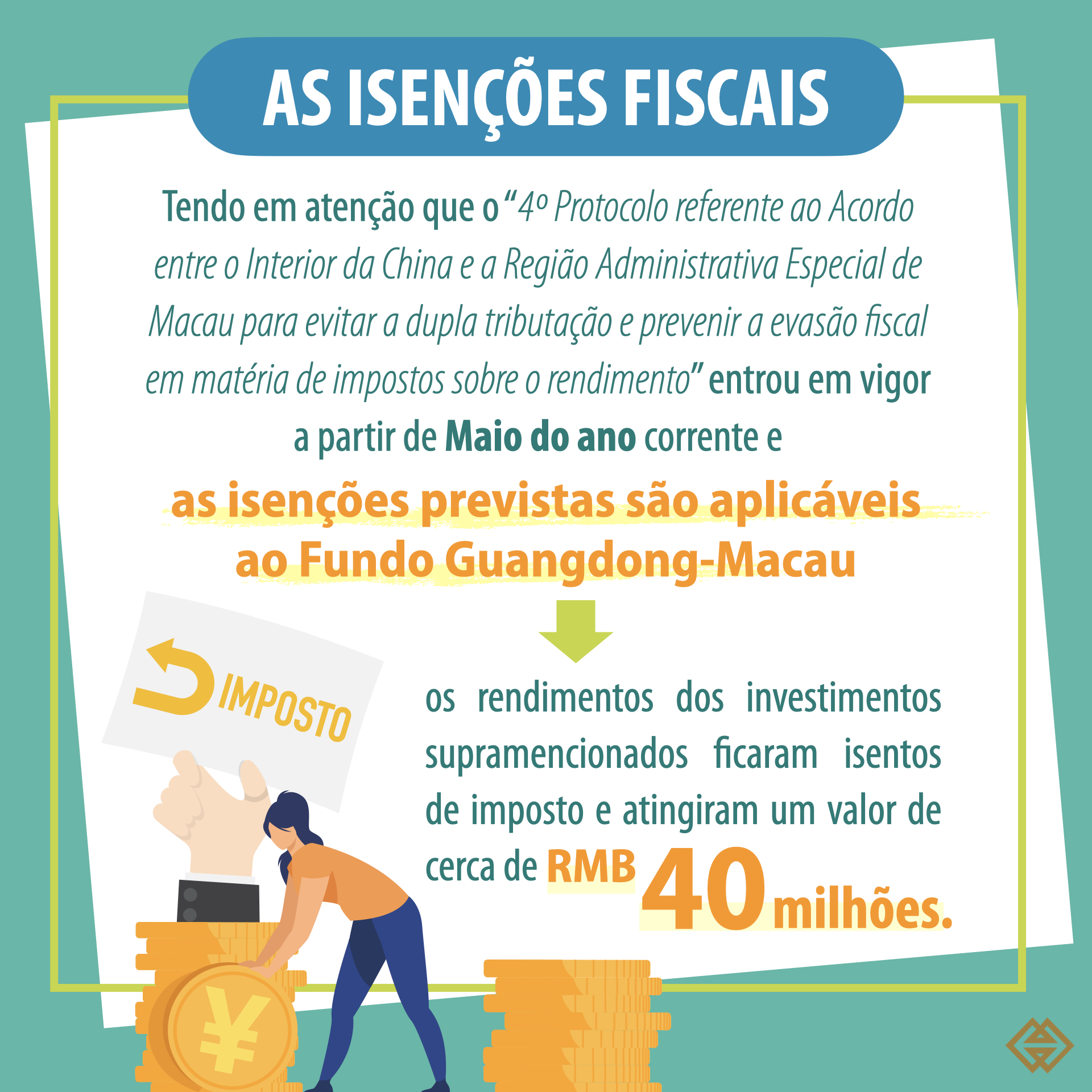 Tendo em atenção que o “4º Protocolo referente ao Acordo entre o Interior da China e a Região Administrativa Especial de Macau para evitar a dupla tributação e prevenir a evasão fiscal em matéria de impostos sobre o rendimento” entrou em vigor a partir de Maio do ano corrente e as isenções previstas são aplicáveis ao Fundo Guangdong-Macau. Assim sendo, os rendimentos dos investimentos supramencionados ficaram isentos de imposto e atingiram um valor de cerca de RMB40 milhões, tendo os rendimentos sido transferidos para Macau.