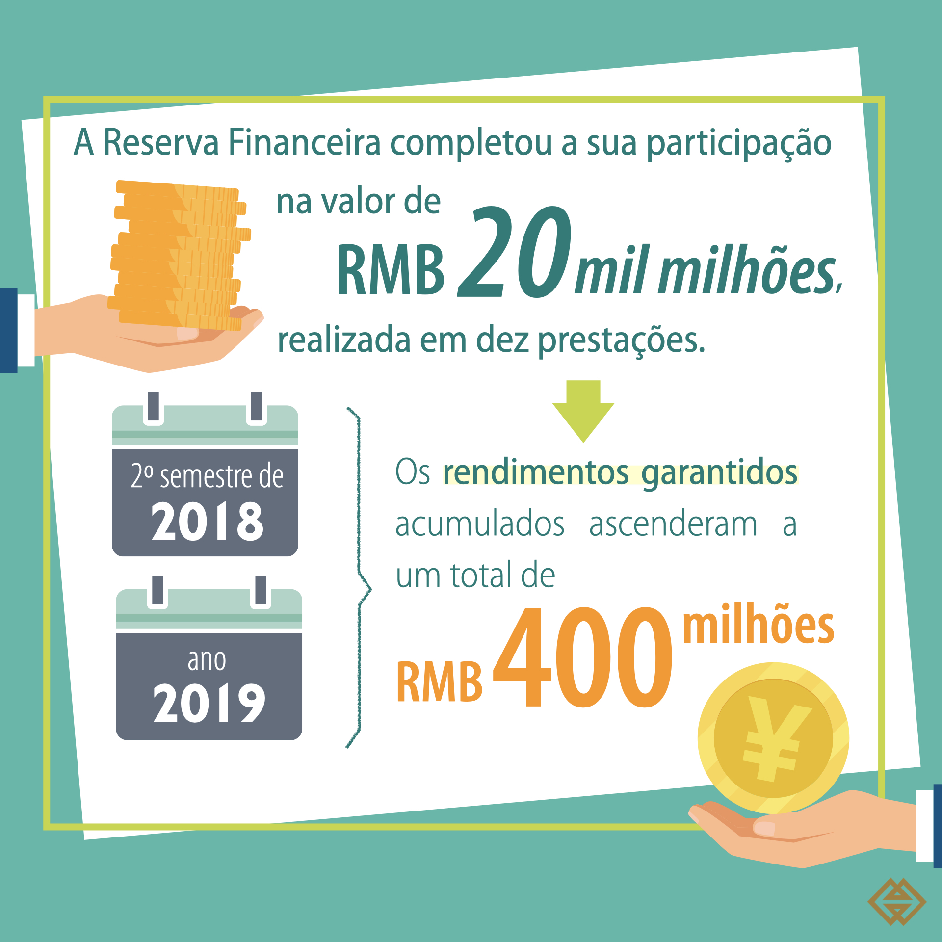 Nos termos do “Acordo-Quadro de Cooperação Guangdong-Macau”, o Fundo Guangdong-Macau foi estabelecido em Junho de 2018 conjuntamente por Guangdong e Macau, sendo que os investimentos foram aplicados, principalmente, em projectos de infraestruturas de alta qualidade na Província de Guangdong, associados à construção da Zona de Comércio Livre de Guangdong e à Grande Baía Guangdong-Hong Kong-Macau e favoráveis à economia e ao bem-estar das populações das duas jurisdições. A Reserva Financeira completou a sua participação no valor de RMB20 mil milhões, realizada em dez prestações. Ao abrigo do previsto no referido acordo, os rendimentos garantidos acumulados dos investimentos da Reserva Financeira junto do Fundo Guangdong-Macau relativos aos anos 2018 e 2019, ascenderam a um total de RMB400 milhões.
