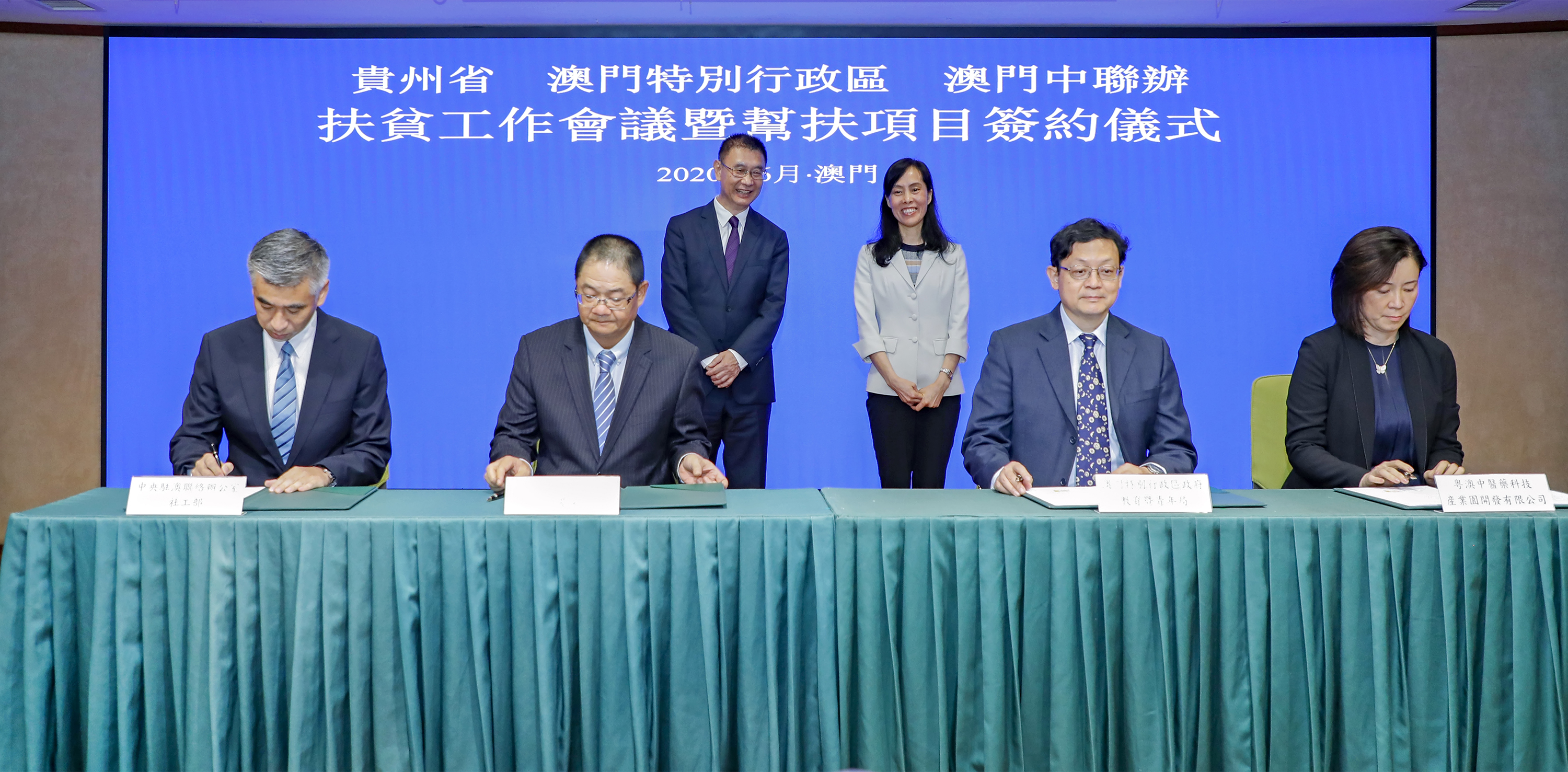 No dia 23 de Junho, o Governo da Região Administrativa Especial de Macau (RAEM), o Gabinete de Ligação do Governo Popular Central na RAEM e o governo da província de Guizhou realizaram uma reunião sobre o trabalho de cooperação no combate à pobreza e uma cerimónia de assinatura de acordos de apoio a projectos específicos. A reunião foi realizada simultaneamente por videoconferência, entre Pequim, Guiyang e Macau. O subchefe do Gabinete do Grupo Dirigente do Conselho de Estado para o Alívio da Pobreza e Desenvolvimento, Hong Tianyun, a secretária para os Assuntos Sociais e Cultura do Governo da RAEM, Ao Ieong U, o subdirector do Gabinete de Ligação do Governo Central na RAEM, Yao Jin, o vice-governador da província de Guizhou, Wu Qiang, participaram no encontro e testemunharam à assinatura de acordos sobre o apoio de Macau ao distrito de Congjiang para projectos específicos no combate à pobreza em 2020.