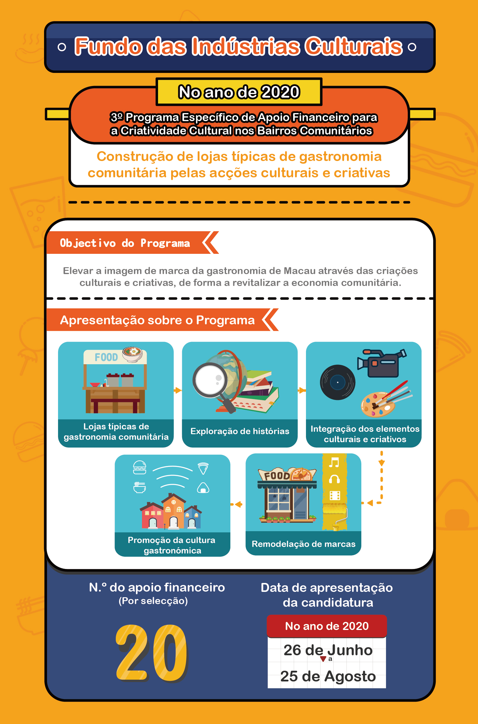 O Fundo das Indústrias Culturais (FIC) irá receber as candidaturas ao 3.o “Programa Específico de Apoio Financeiro para a Criatividade Cultural nos Bairros Comunitários”, no período de 26 de Junho a 25 de Agosto, destinado a lojas típicas de gastronomia em bairros comunitários.